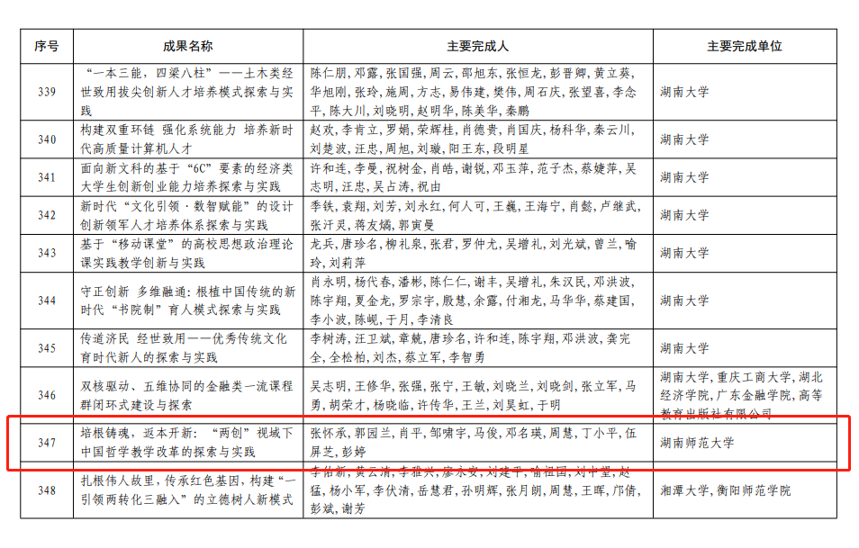 张怀承教授团队申报的教学成果“培根铸魂,返本开新:‘两创’视域下中国哲学教学改革的探索与实践”荣获2022年高等教育(本科)国家级教学成果奖二等奖。