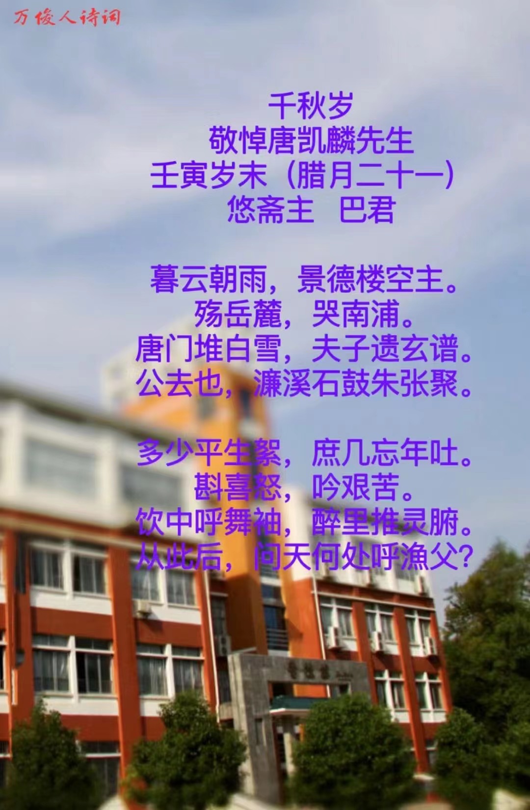 沉痛悼念唐老师,先生千古!拟一挽联以表达哀思: