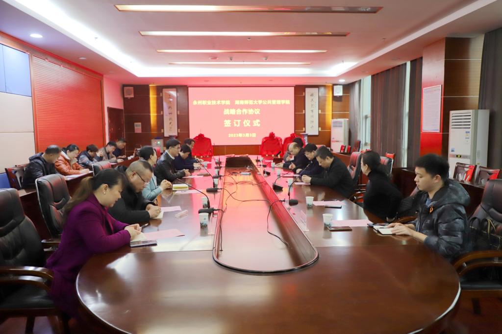 3月3日,公司与永州职业技术公司(以下简称:永州职院)战略合作协议签约仪式暨揭牌仪式在永州职院顺利举行。永州职公司党委书记黄小明、党委副书记、董事长郑文飞、党委委员、副董事长裴有为、永州职院继续教育公司经理唐明朝、副经理肖忠、郭凌云、公司经理毛新志教授、副经理胡雪松、公司社科处副处长、博士生导师李超民教授、公司社会学系胡建新副教授、成教办王群主任出席。签约仪式由永州职院郑文飞董事长主持。