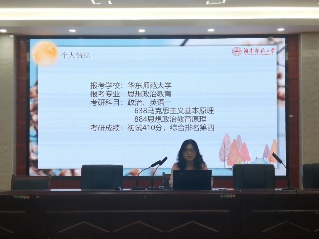 接着,2018级思政二班10位同学依次发言,分享了自身的保研考研经验。田意雨结合亲身经历讲解了综合保研的流程和个人感悟,严俊丽介绍了卓越教师保研计划的申请条件、培养模式,唐晓雪阐述了农村硕士保研计划的优点及准备过程,周诗音就支教保研的应招准备及流程进行了讲解,段晨曦讲述了如何海外申研,陆圣圆分享了各科目复习的建议,王金玲说明了调整心态的重要性,郑瑶介绍了少数民族高层骨干人才计划和考研心得,袁涵怡表示调剂最重要的是信息战,胡岑介绍了考取本校的经验和心得。在交流提问环节,2018级的同学对2019级同学的困惑进行了答疑。
