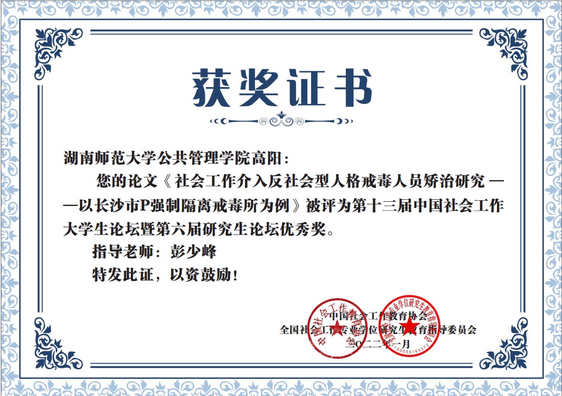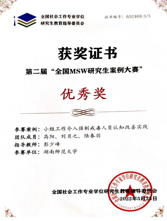 近期,第二届全国MSW研究生案例大赛决赛暨颁奖典礼在线上举行,公司彭少峰副教授指导,社会工作专业硕士生高阳、刘贝之、陆春羽团队撰写的案例《小组工作介入强制戒毒人员认知改善实践》荣获优秀奖。