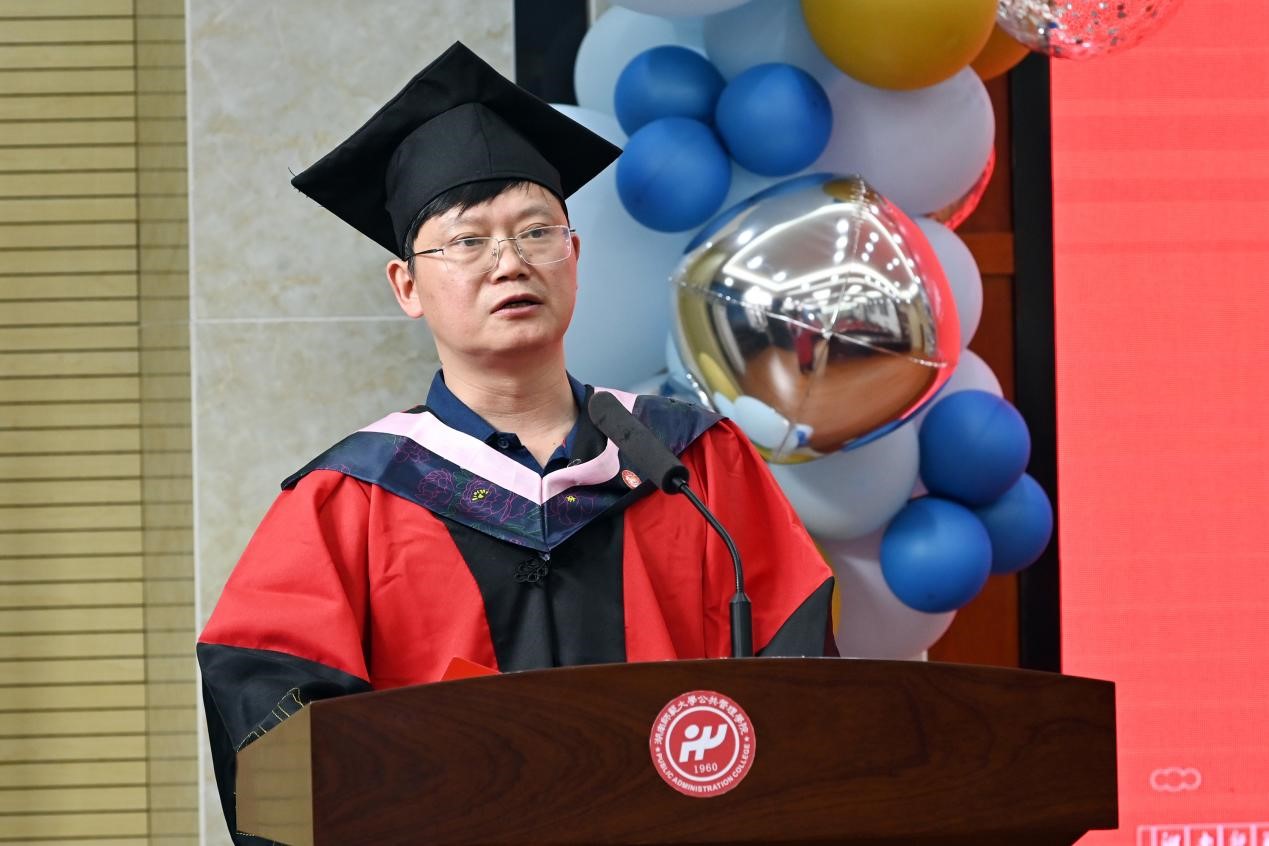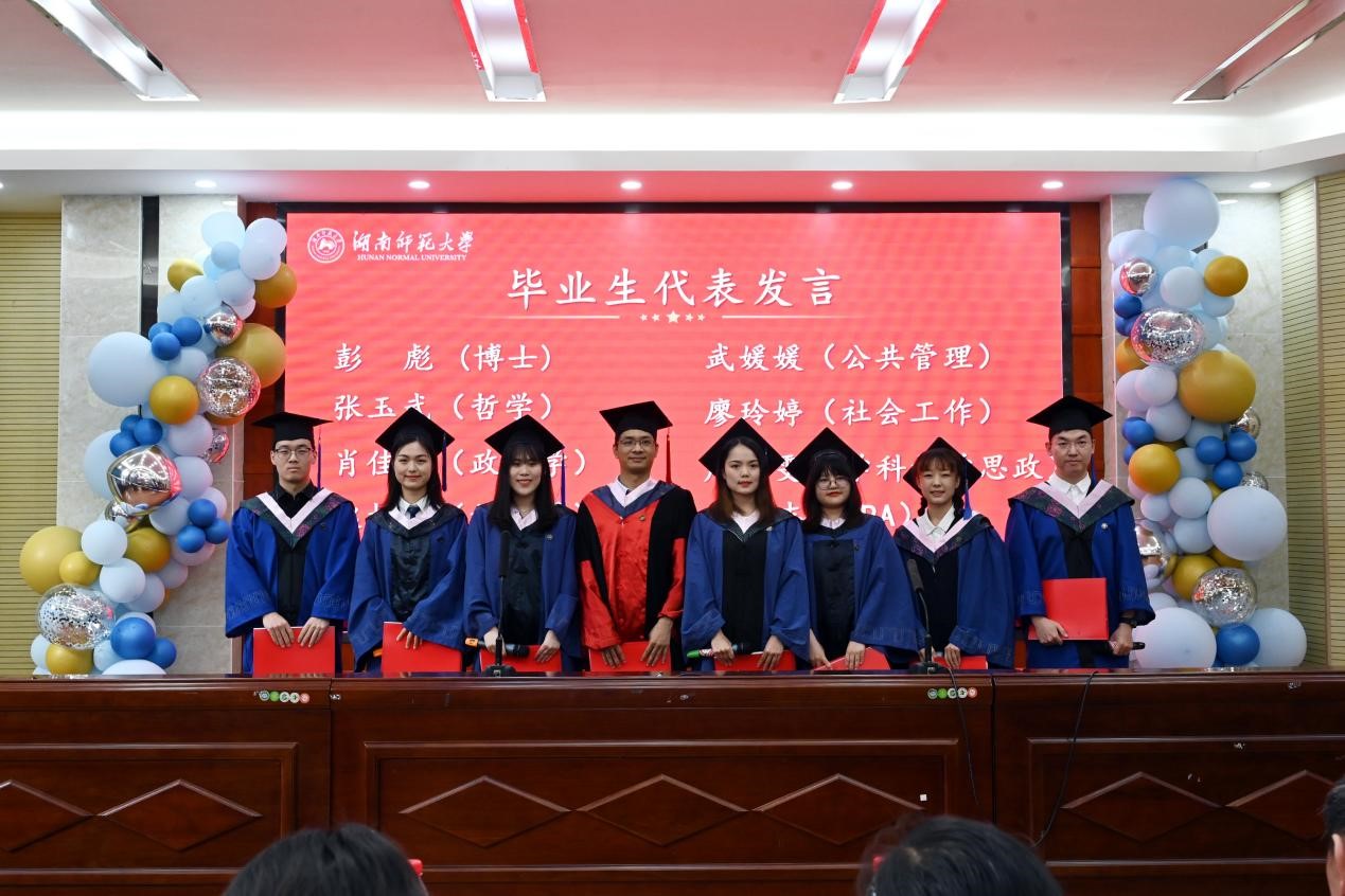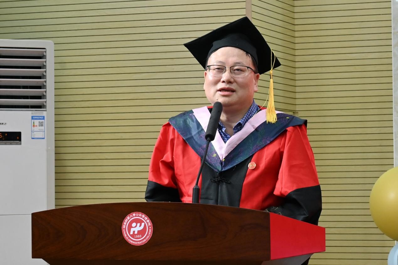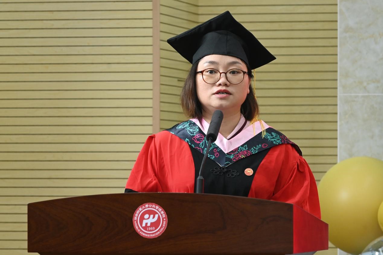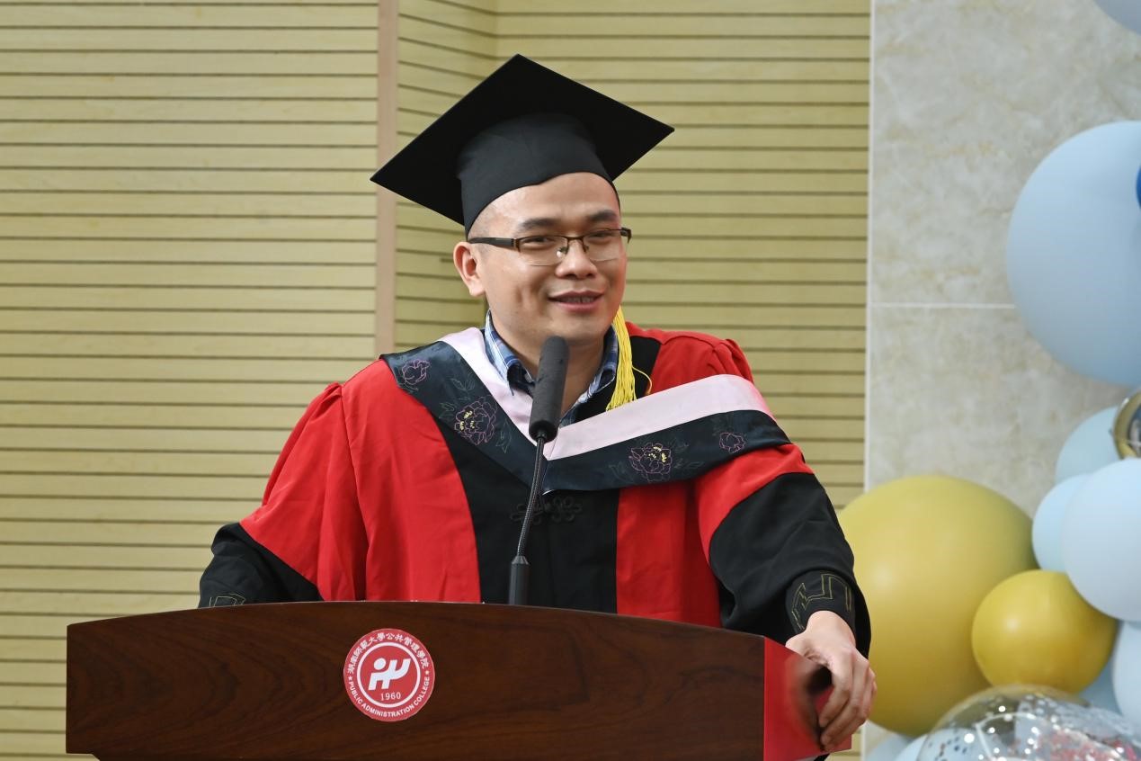 随后,研究生导师代表向玉乔老师、谭卫华老师和谢宗藩老师分别寄语。向玉乔老师以“做精神强大的人”为主题,鼓励毕业生们保持积极向上的人生态度,勇于迎接时代挑战,胸怀大格局,成就大作为。谭卫华老师以自身的奋斗经历为引,勉励大家学会静心和静思,做到坚持与感恩,牢记母校母院嘱托,情系家国,心怀仁爱,做有益于社会的优秀公管人;谢宗藩老师向毕业研究生们提出三点希望,希望大家坚定理想,永葆赤子之心;臻于至善,永葆学习之心;无惧风雨,永葆进取之心。博士毕业生彭彪以及各学科硕士毕业生张玉武、肖佳妮、武媛媛、赵相帅、廖玲婷、周雯和曹志8名毕业生代表分别发言,依次分享了他们在公管院的求学成长经历,表达了对母校、母院、恩师的感激之情以及对未来的期待与憧憬。