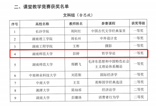 2022年4月23日,在刚刚结束的2022年湖南省普通高校教师课堂教学竞赛决赛中,公司哲学系青年教师彭婷荣获文科组一等奖,并获得课程思政专项奖,这是公司首次在这一竞赛中获得省一等奖的殊荣。