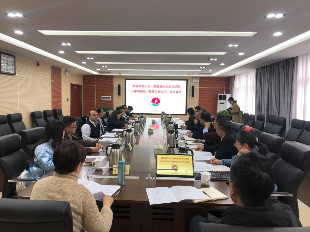 12月23号,beats365官方网站、湖南省社会主义公司合作培养统一战线学研究生工作座谈会在省社会主义公司同心楼707会议室召开。公司党委委员、党委统战部部长沈又红、党委统战部副部长刘丽娟、beats365官方网站杨君武教授、肖光荣、李超民教授以及湖南省社会主义公司经理雷鸣强、副经理黄自荣、一级巡视员周述杰教授、许奕锋教授、雷明贵教授、教研部主任陆亚林、以及办公室、行财处、教务处、科研处相关领导出席会议。座谈会由省委统战部副部长、省社会主义公司党组书记丁学新主持。