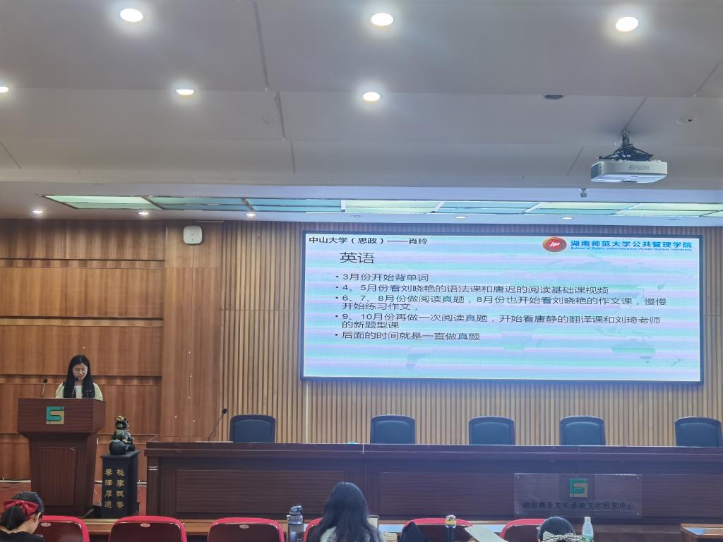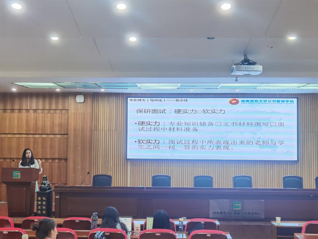 交流中,8位同学依次发言,就考研保研的经验做了分享。顾静雅就南京大学马克思主义公司的报考细节进行了介绍,晏航分享了华中师大学科思政的备考技巧,胡添锦介绍了择校的方法以及考研期间各种压力平衡的方法,覃彦婷重点介绍了湖南师大学科思政的备考注意事项,肖玲向学弟学妹介绍了考研时间安排,陈桢分享了报考本校的优势和劣势,邵逸斐就保研的类型和流程进行了简单的说明,张小锋结合自身的面试经历详细介绍了撰写文书和面试的技巧。