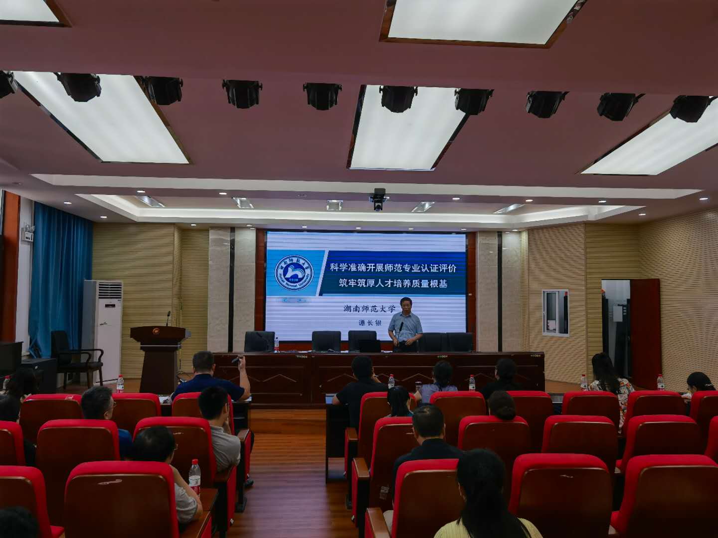 接着资环院谭长银副经理以“科学准确开展师范专业认证评价 筑牢筑厚人才培养质量根基”为题做了讲解,他围绕师范专业认证评价体系、人才培养目标合理性及达成情况评价、毕业要求合理性及达成情况评价、课程体系合理性评价、课程目标达成度评价五个方面做了具体阐述。