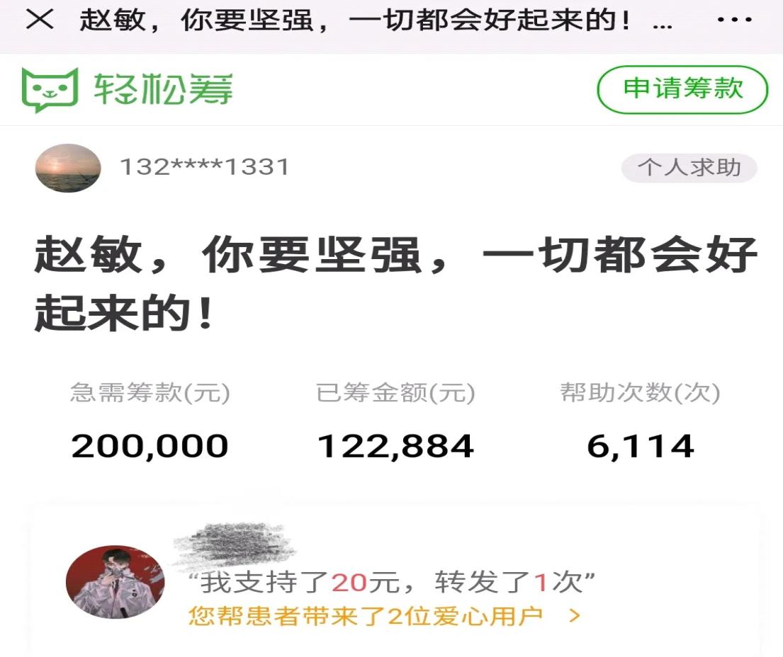 4月9日,一篇紧急的微信推送打破了深夜本该有的宁静,在朋友圈迅速转发、扩散,不到24小时,阅读量超过8600,朋友圈分享转发次数达到753次,筹款超过3万元。在这背后除了每一个关心赵敏的人的积极转发,更是一个由10个人组成的“天然气能源”救助组持续努力运作的结果。8日,赵敏身边的几位同学自发地想为她做些什么,得知目前她家手头活钱已经基本用完,轻松筹善款提出还需要一段时间后,几位同学就用自己注册的个人公众号发起了微信筹款募捐活动。连续几个日夜,他们难以安眠,持续盯着微信后台;他们食之无味,却在微信群里一直互相打气加油。他们意识到,“天然气能源”是赵敏生的不竭精神动力,10个人谁都不可以倒下。除了早期发动宣传筹措资助外,还要每天发送关于赵敏近况的文案报道,以回馈那些关心她帮助她的善良的人们。就是这样,源自对赵敏的担心与关爱,一直坚持着,又为她打开了一条生的通道。