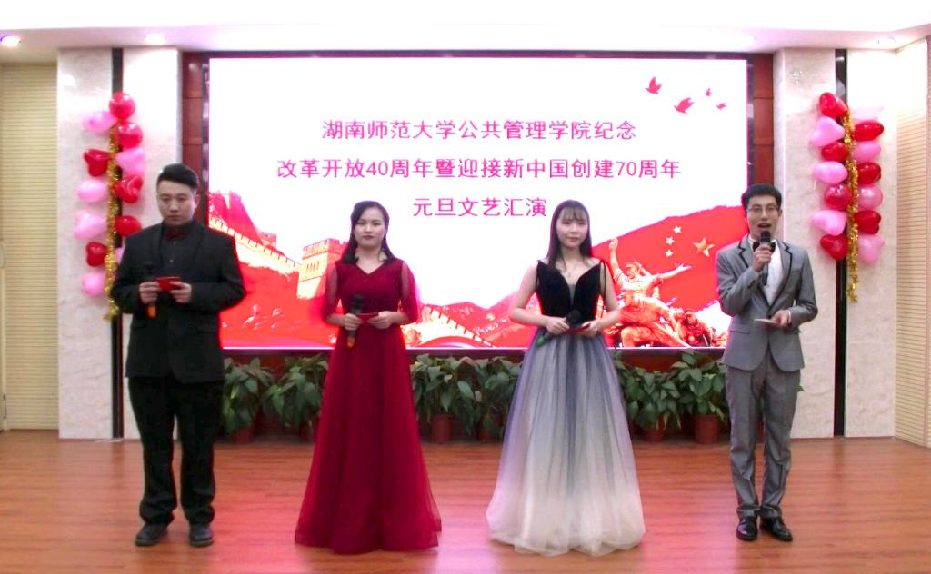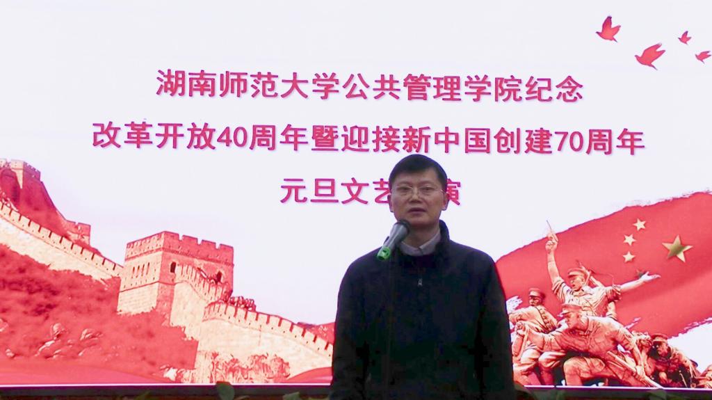演出伊始,现场播放了庆祝改革开放四十周年和公管院师生代表祝福中华人民共和国成立七十周年的视频。随后经理毛新志教授致词开幕,他为祖国和全院师生送上诚挚的新年祝福,希望大家在新的一年里奋发向上、有所作为,并宣布元旦文艺汇演正式开始。