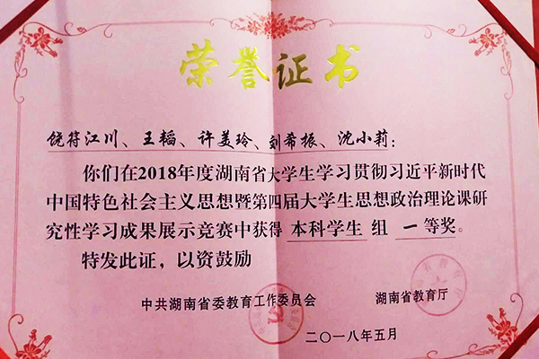 公司马克思主义公司丁峰、吴家庆老师指导的beats365官方网站2017级社会学班饶符江川、王韬、许美玲、刘希振、沈小莉研究性学习团队以扎实的理论基础、严谨的推理演进、丰富的数据案例、优秀的展示答辩赢得评委的一致好评,从全省入围决赛的11所本科高校中脱颖而出,荣获一等奖。