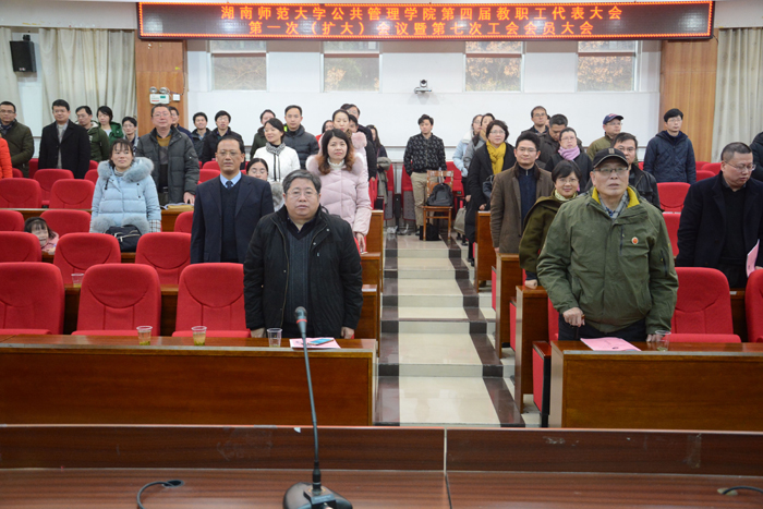 第一阶段会议由副经理杨君武主持。会议伊始,全体起立,奏唱国歌。原工会委员会主席陈晓红通报会议筹备工作和参会人员情况,在对新一届工会委员候选人名单的产生进行说明后组织进行工会委员选举。余望成在院2017年年度工作报告中从各个方面详细介绍了公管院一年取得的成绩,他重点阐述了2017年院的团队建设情况,在讲话中他提出对青年教师进行扶助以及工作“稳中求进”的策略。副经理邝洁对2017年度财务情况做简单报告。之后,余望成宣布新一届工会委员名单以及院“和谐家庭”当选结果。