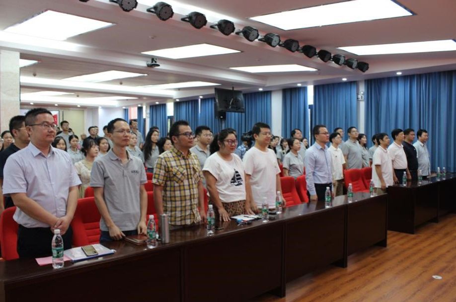 开学典礼在庄重的国歌声中拉开序幕,全体师生起立奏唱国歌。