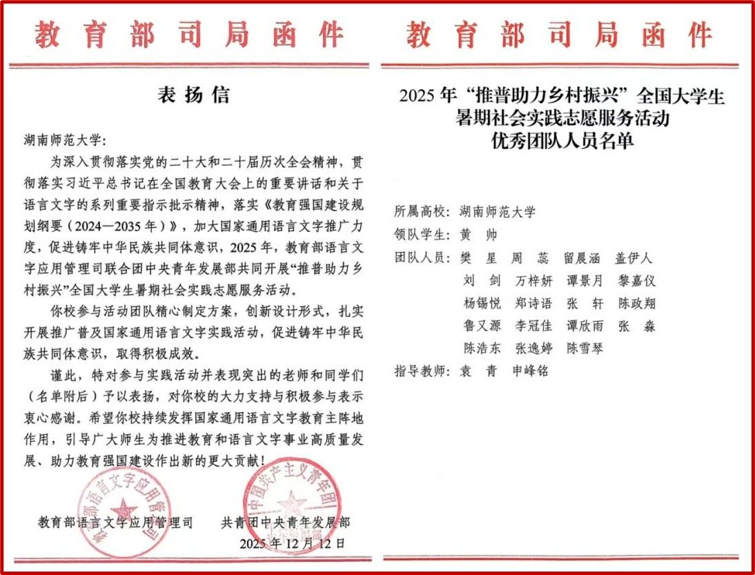 (通讯员 黄帅 刘剑 谭欣雨)近日,由政治学与行政管理系副教授袁青老师、辅导员申峰铭老师指导的“奋楫者”暑期社会实践团队被教育部语言文字应用管理司、共青团中央青年发展部联合发函表彰。团队在2025年“推普助力乡村振兴”全国老员工暑期社会实践志愿服务活动中的表现突出,成效显著,获评优秀团队。