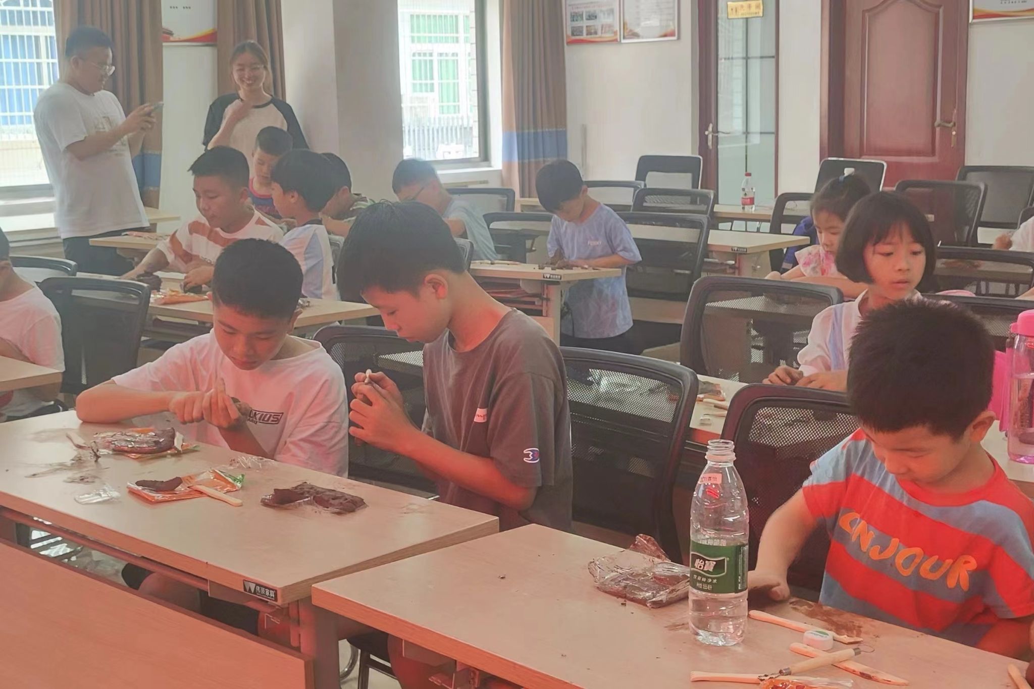 班会课结束后,胡佳磊、胡元浈协同有教学任务的实践团成员组织员工调整座位,开展接下来的课程。