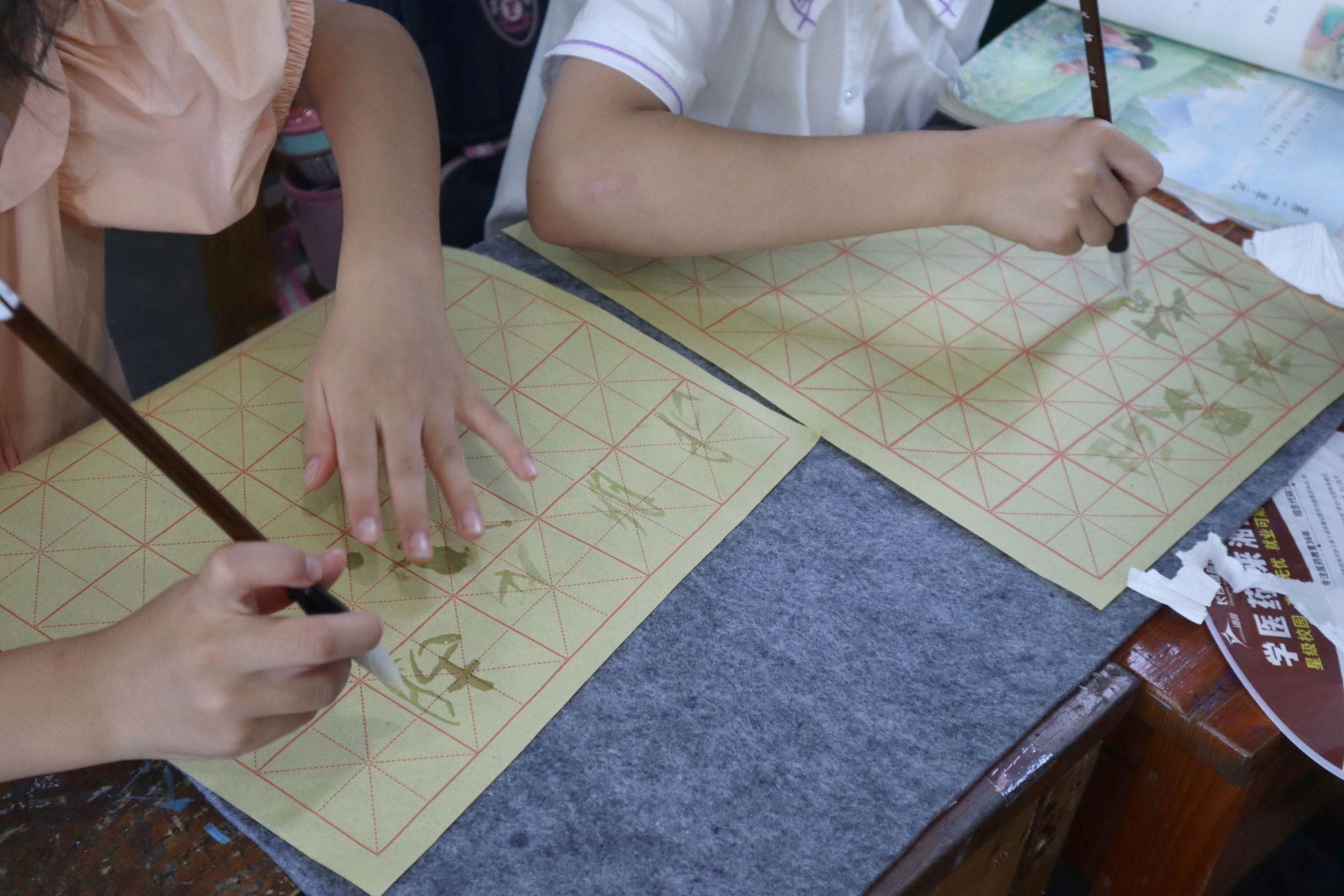 上午,实践团成员余沁霏从汉字的发展历史出发,结合生活实际,为孩子们介绍文房四宝,引领孩子们发现汉字之美;在体验书法的过程中,余沁霏教授孩子们正确的书写姿势,帮助其养成良好的书写习惯。孩子们认真听课,积极配合,用心学习毛笔字。