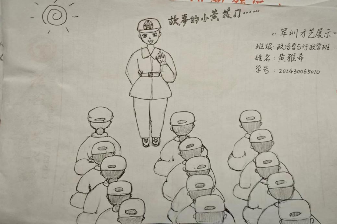 新生们用笔画勾勒出一幅幅简单而又独具特色的绘画作品,展现出军训场上的勃勃英姿。有的作品刻画了教官们笔直的站姿和坚定的目光,彰显着职责与担当;有的描绘了军助们辛勤忙碌的身影,以此表达对军助们无私关爱的感谢;还有些作品记录了军训中的欢乐趣事,如休息间隙的欢声笑语、激情澎湃的拉歌比赛场面。
