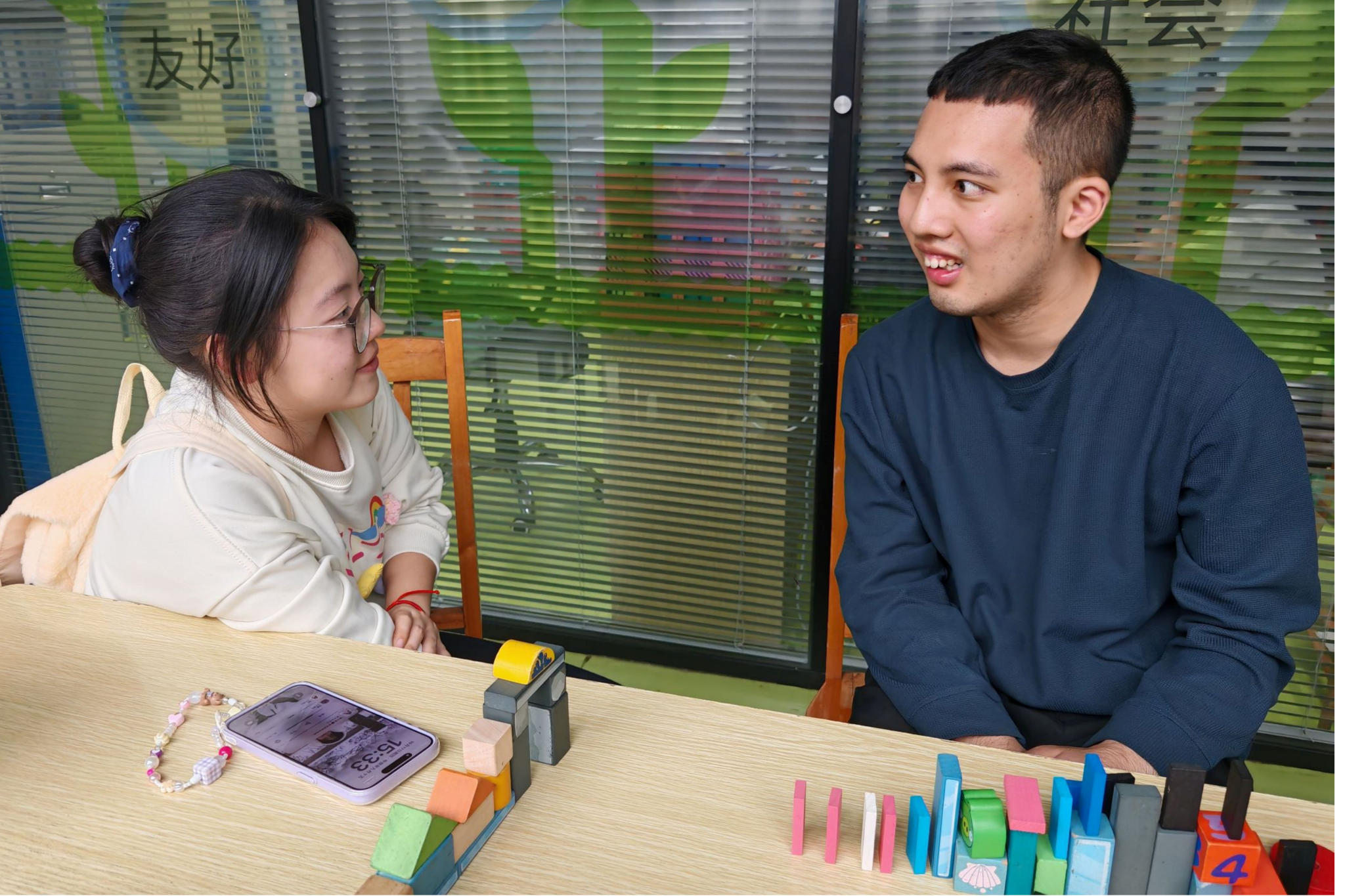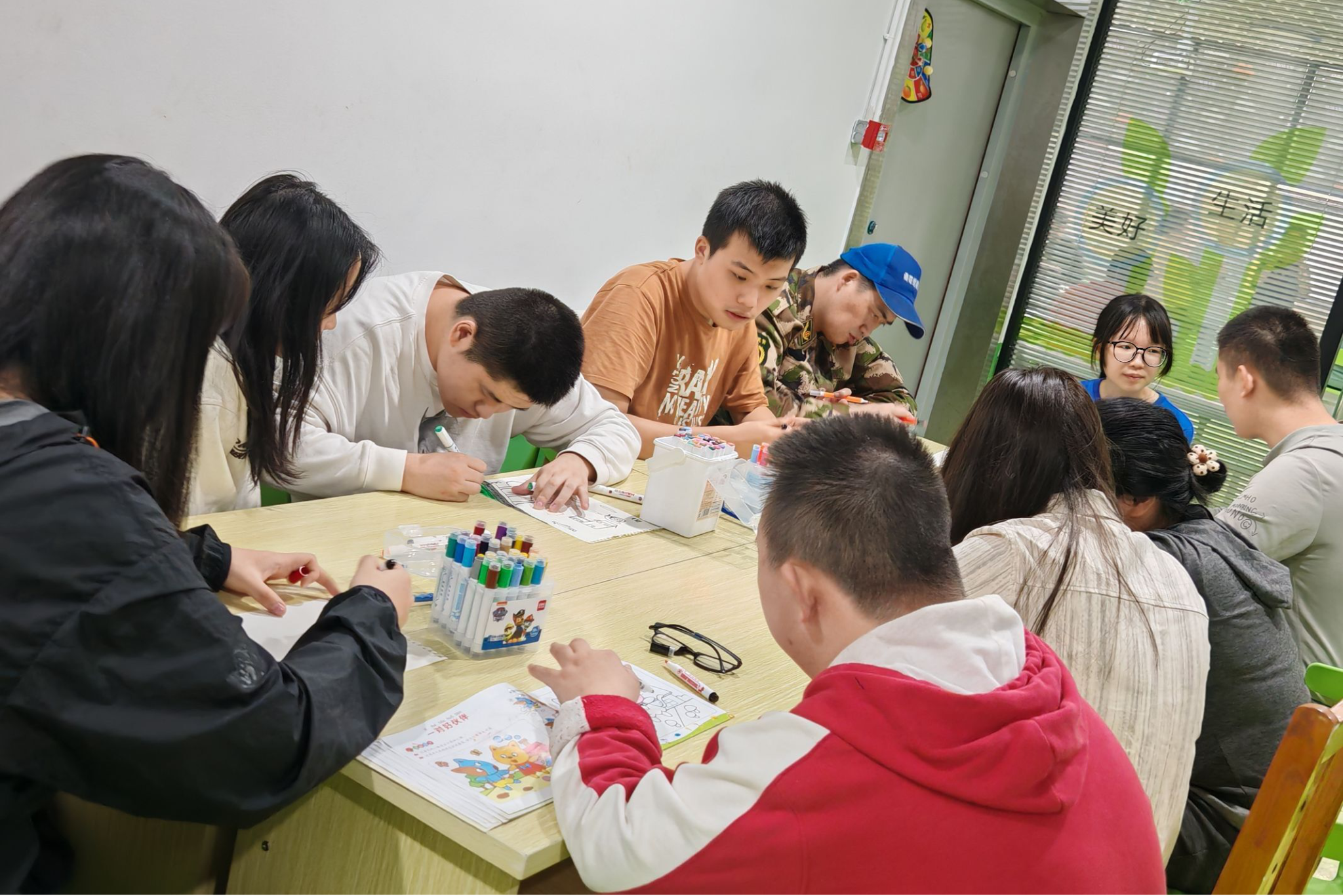 活动前期,青工部干事刘弈男、王茜蕊与服务中心工作人员对接工作,协调志愿时间,收集公管院与各协办公司志愿者信息,对志愿者进行筛选与培训,提高志愿者服务能力保证活动正常开展。活动期间,志愿者们被分为阅读组、活动组两部分,以“1对1”的形式开展活动。阅读组志愿者陪伴服务对象进行绘本阅读,用讲解、朗读的形式引导服务对象进行探索与思考,提高服务对象认知能力。活动组成员与服务对象进行“我手画我心”涂色游戏与唱歌游戏,通过创意绘画,大声歌唱等形式提高服务对象表达能力、动手能力。活动最后,志愿者与服务对象共同装饰“愿望墙”,分享自己的故事与愿望。