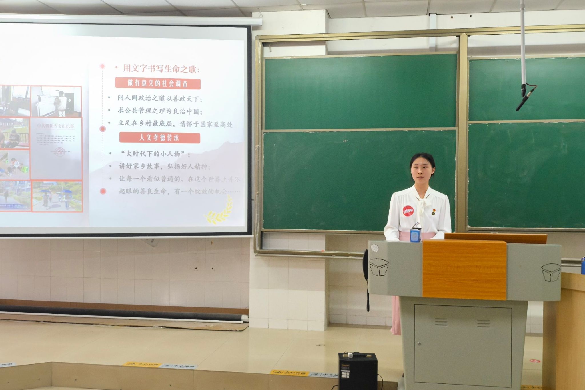 会议伊始,主持人鲁清清介绍“芙蓉学子”评选活动主办方以及活动宗旨。此次评选的奖项分为社会实践奖、公益行动奖、自强不息奖、道德风尚奖和学术科研奖。接着,20个来自不同公司的候选人和团队按奖项依次宣讲。候选人图文并茂,向观众分享他们的奋斗故事,这不仅传递了榜样力量,而且给在场的观众留下了深刻印象。其中,来自公管院的杨粞蜓参与了道德风尚奖的评选,她的宣讲展现了她对公共事务的关心和对社会责任的担当,同时也为公管院学子指明了努力方向。