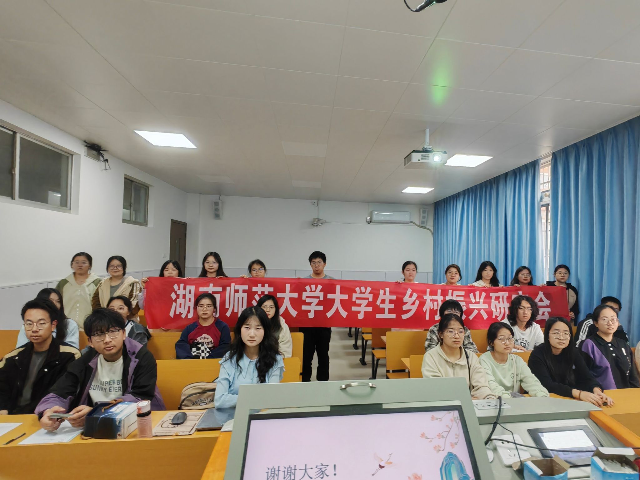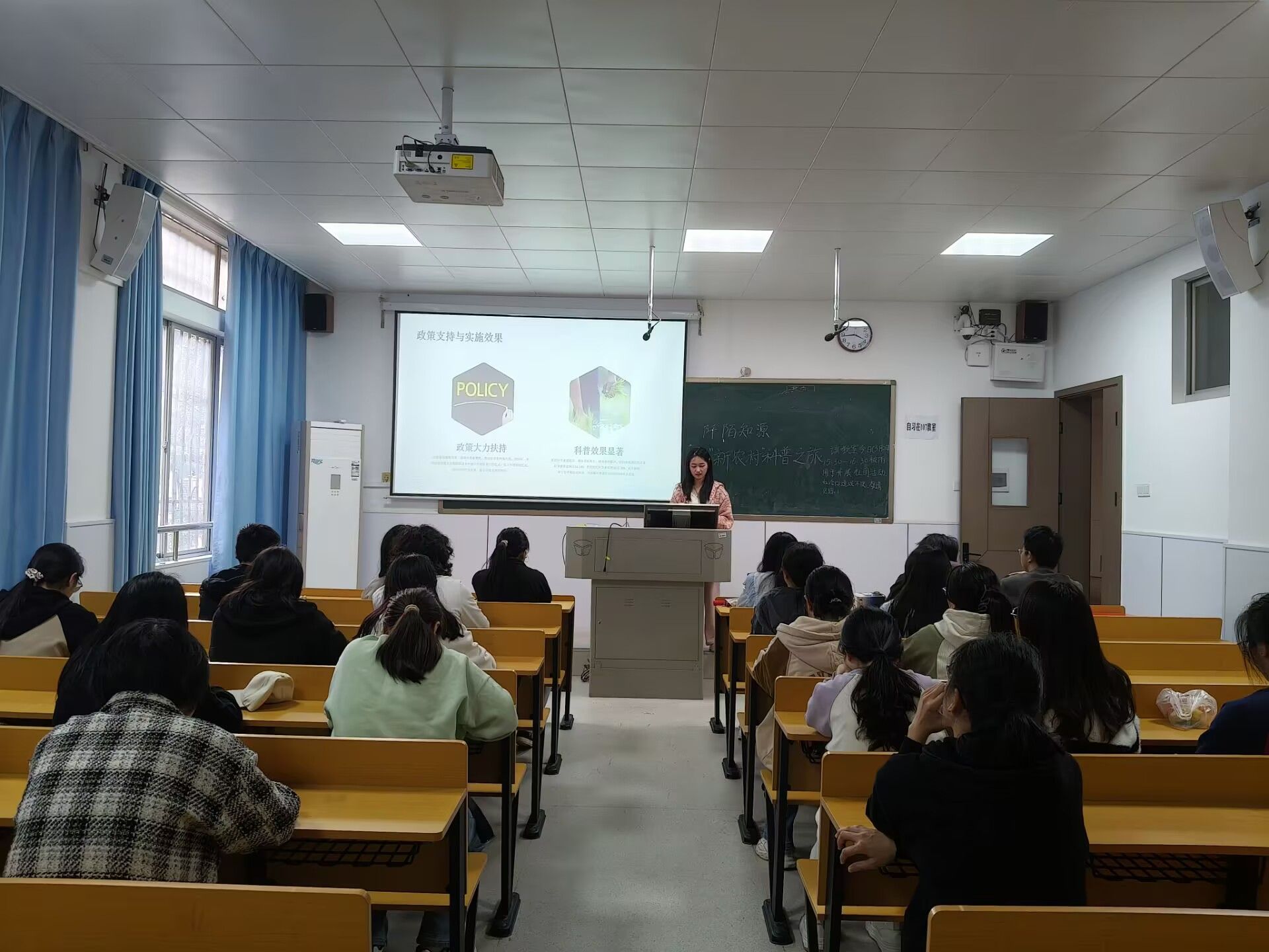 此次活动由乡研会理事长刘敏佳主持讲解。活动开始阶段,通过一段“了不起的年轻人——投身新农村”视频,参会人员了解农村在生产主力军方面的革新变化,更多的年轻人回到乡野怀抱。活动过程中,主持人通过详细生动的讲解,引用发生在身边的真实案例,使同学们对于近年来农村在经济、生态、文化等方面的“新变化”有了更清晰的认识。活动结束后,参会人员进行合影留念,展现了新青年的风彩。