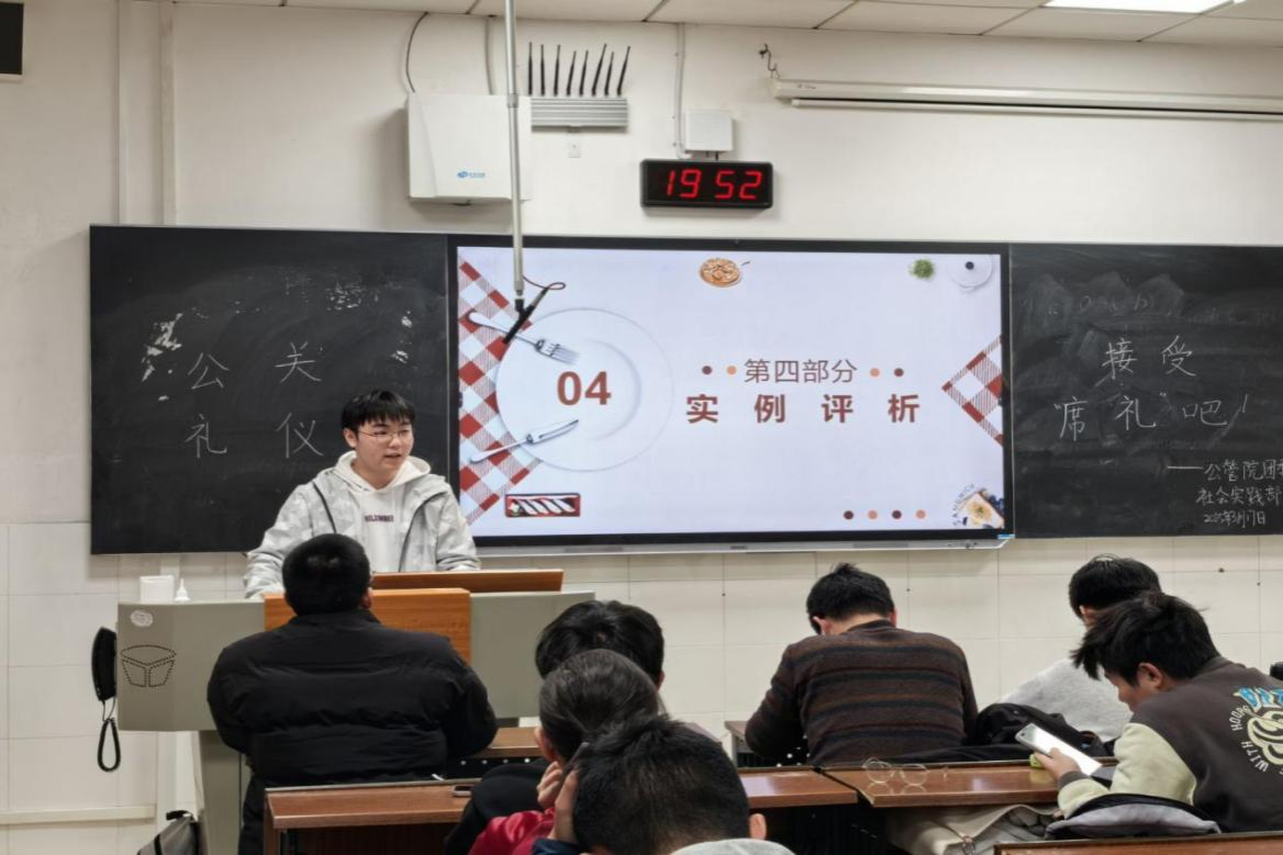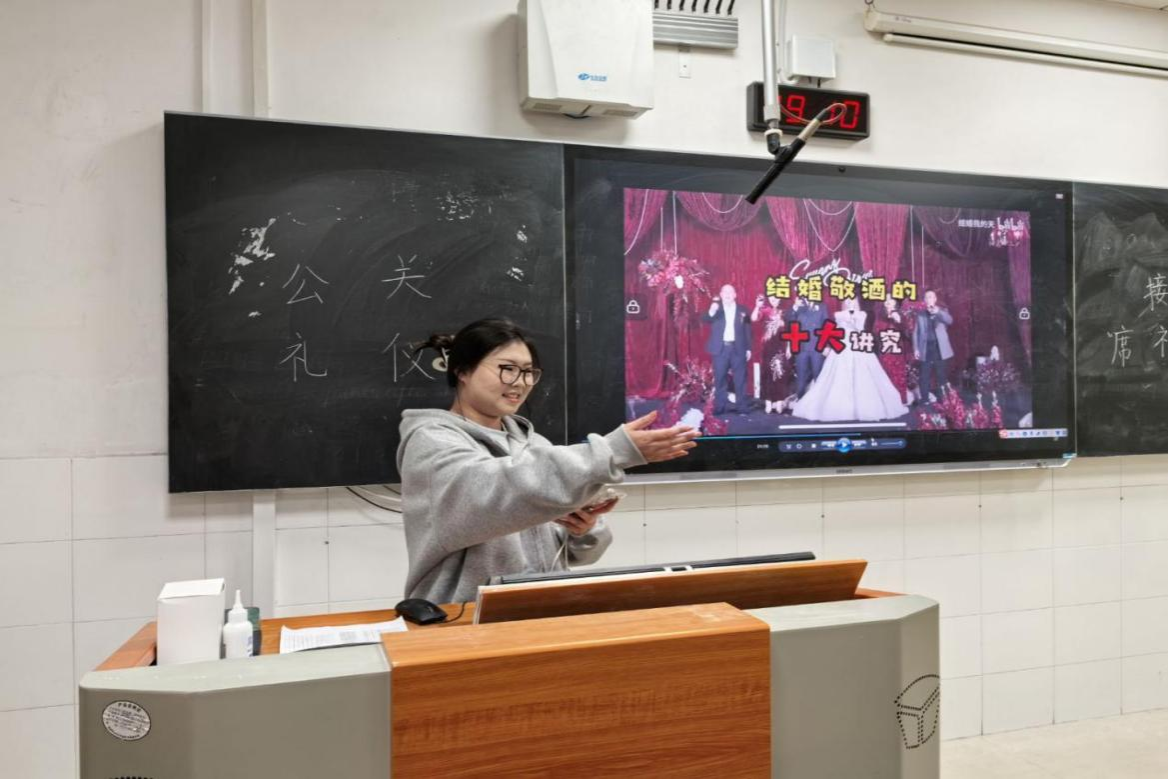 在主持人介绍完活动背景和目的后,学员们以小组为单位,依次结合视频对课前准备的宴会礼仪、宴席规范进行了深入讲解。在此过程中,学员们积极参与,采取了情景演绎、互动问答等形式,为同学们展示了不同地区各具特色的礼仪风俗。最后,主持人分别对各组同学的汇报进行了点评,并表示公关礼仪不仅是客观的理论知识,更是需要内化于心、外化于行的行为规范。