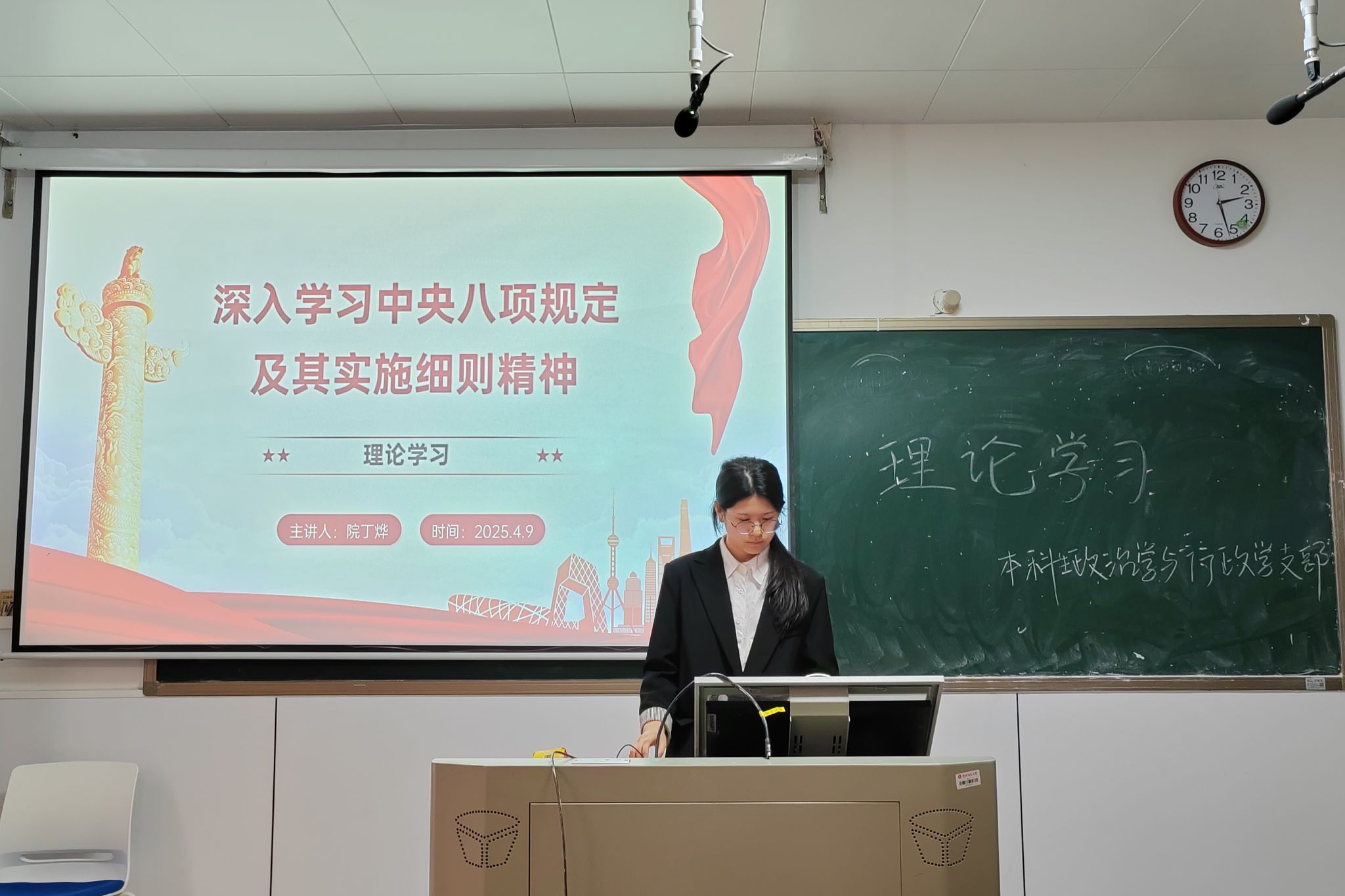 (通讯员 朱姿瑶 陈茜 谭欣雨)为深入学习贯彻习近平总书记关于加强党的作风建设的重要讲话精神,深化全面从严治党实践,推动作风建设常态化长效化,4月9日中午,本科生政治学与行政学党支部(以下简称“政行党支部”)于至善楼106教室开展以“学习中央八项规定及其实施细则精神”为主题的四月理论学习活动。活动由院丁烨担任主讲人,政行党支部全体成员参加。