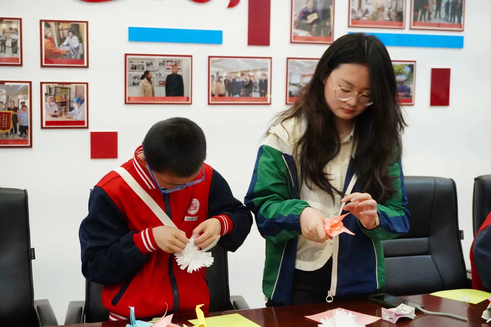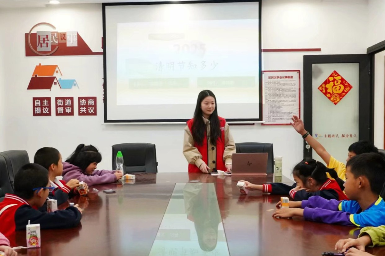 活动伊始,打扫组的同学们拿上全套工具,认真清扫社区服务中心以及周围街道,在劳动中挥洒汗水,以实际行动践行劳动精神。在与社区少年儿童的互动中,宣讲组的同学分享了清明节的由来、习俗和先烈故事。现场气氛逐渐升温,孩子们积极举手抢答,传统文化知识在寓教于乐中浸润童心。手工组的同学们引导孩子们在纸上写下对先烈的敬意、对已故亲人的思念。随后,同学们和孩子们一起折纸鸢、剪菊花。菊花承载缅怀之意,纸鸢放飞希望之羽,蕴含“继往开来,踔厉奋发”的精神。