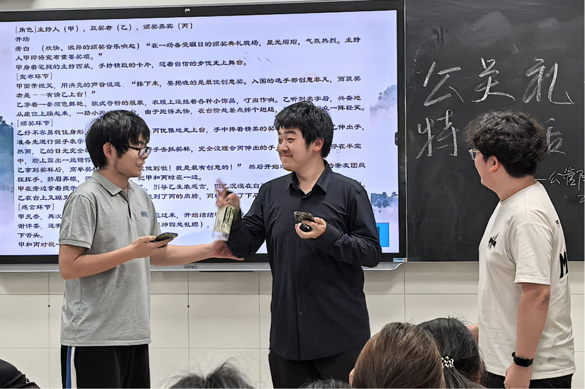 在活动中,同学们通过自主组队和随机分配形成六个小组,由组长抽取送别情景剧本进行演绎。经过20分钟的排练,各小组依次登台展示,演绎内容涵盖商务送别、友人告别等常见场景。表演结束后,各小组组长现场总结剧本中的礼仪错误并示范正确做法,台下同学参与点评。
