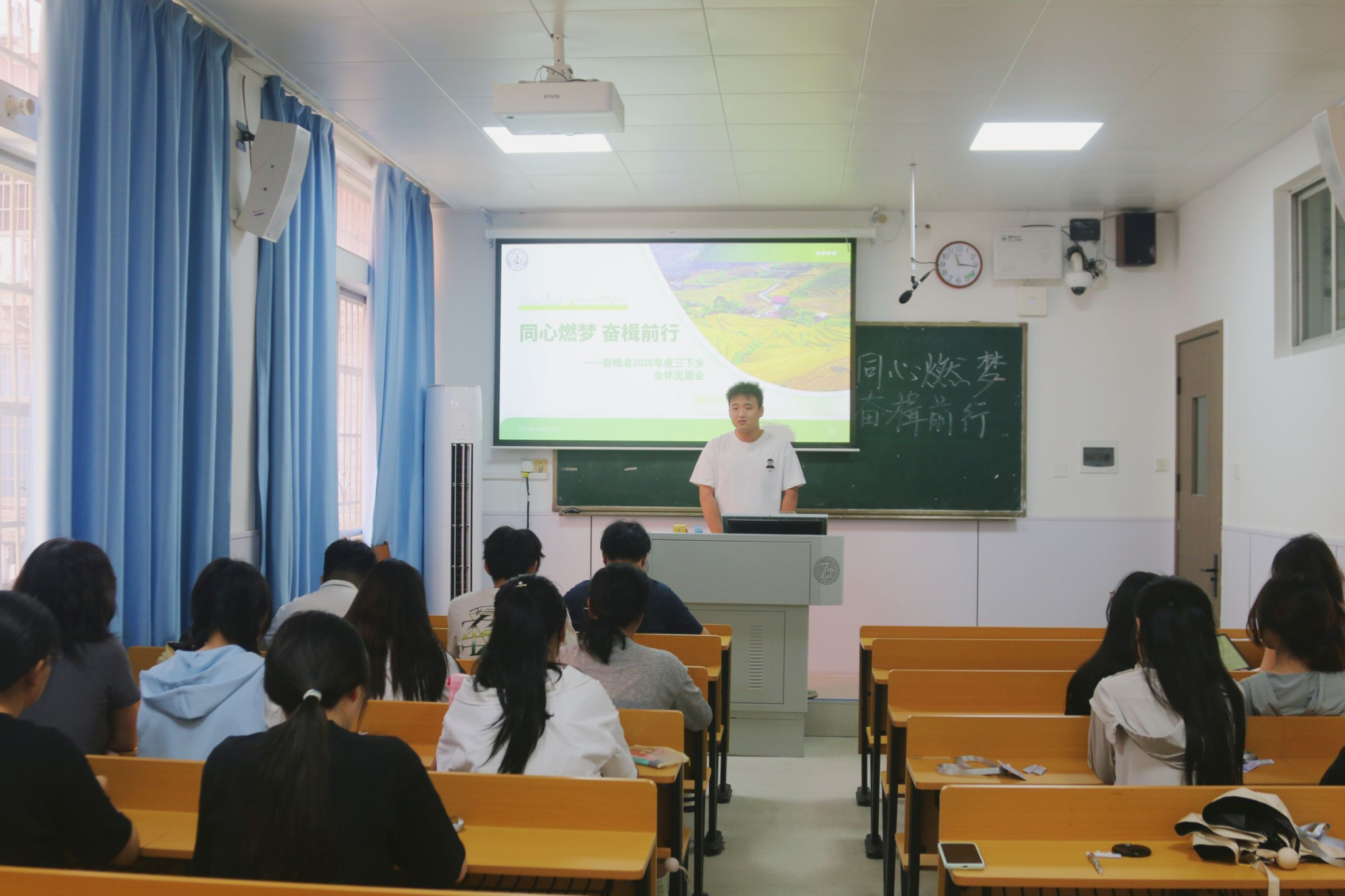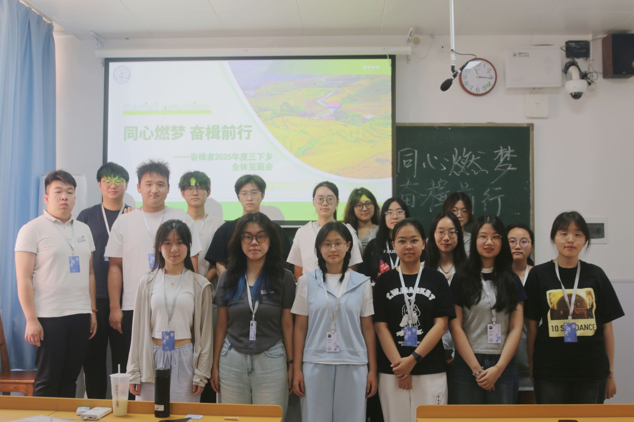 樊星首先对开展实践的地点、背景及环境等关键信息进行介绍,并点明三下乡活动的核心任务目标与具体活动要求,帮助成员们了解实践情况。各成员分别进行简短自我介绍,以增进团队之间的相互熟悉程度。随后,调研、教学、宣传等各分组组长上台阐述组内的工作计划与安排,表达对成员们团结有序完成组内任务的期望。会议末,樊星对于会议做出总结,强调实践团在实践与调研期间的注意事项,例如保证个人安全与团队集体和谐等,他在总结中表示了对于成员们的信任与支持,并期待全体成员戮力同心、共同在完成实践任务的同时留下美好回忆。“奋楫者”实践团全体成员合影留念,至此会议结束。