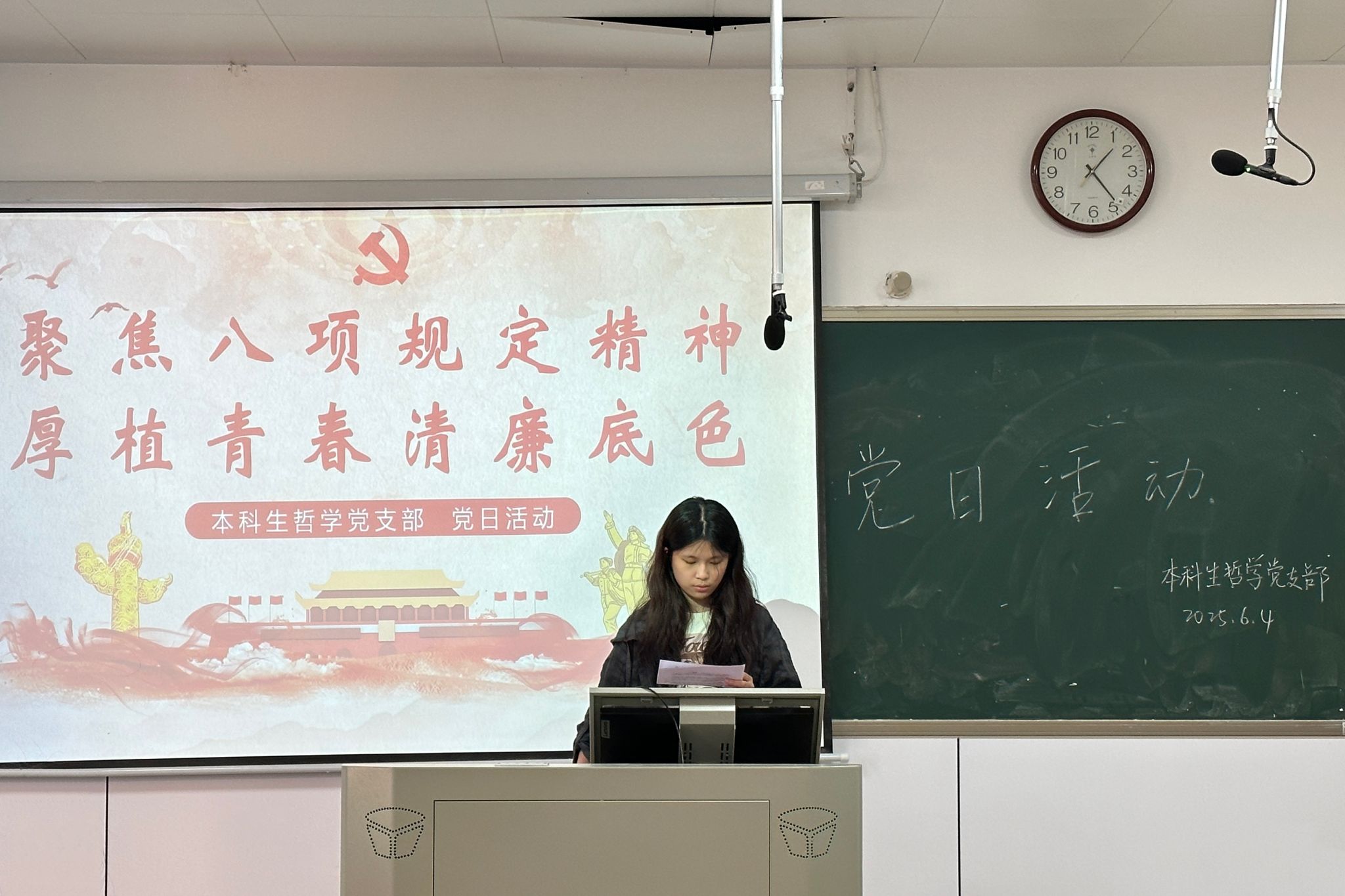 (通讯员 刘静莹 盛若水)为切实提升支部成员的纪律意识,6月4日下午,beats365官方网站本科生哲学党支部(以下简称“哲学党支部”)在景德楼中栋110教室组织开展了“聚焦八项规定精神,厚植青春清廉底色”主题党日活动。