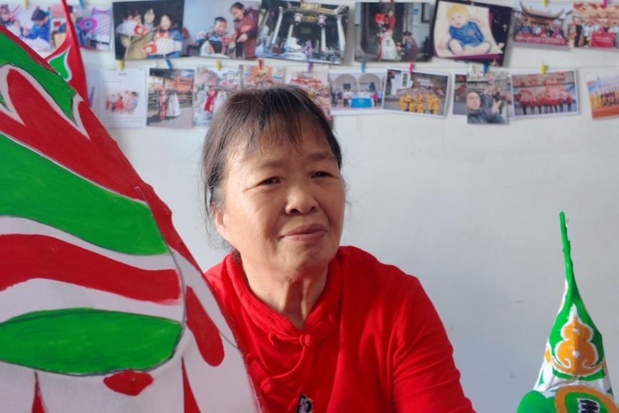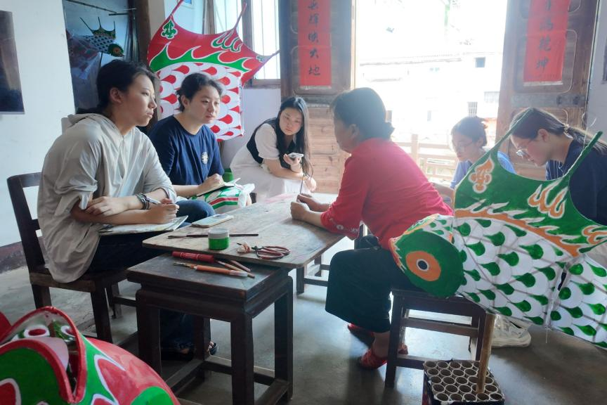 汪胜娟一边给手里的鱼灯上色一边为调研团成员介绍鱼灯的制作方法,“先用经过剥皮、浸泡、晒干、炙烤、软化等工序的竹篾编制鱼骨架,再用绵纸糊成鱼皮,然后描线开脸,依照轮廓上色……”。她强调,当地人奉鱼为神,对其的信仰是极为深厚的。她还表示,鱼灯文化是汪满田村村民历经600多年一代代传承下来的,开展嬉鱼灯活动的过程中必须尊重传统,在此基础上,她持着开放的心态支持鱼灯技艺与文化的创新性发展及适当程度的产业化。同时,她也讲述了当地鱼灯技艺传承的曲折故事,当前大多数村内的年轻人都外出务工,使得鱼灯文化的传承变得更加艰难。