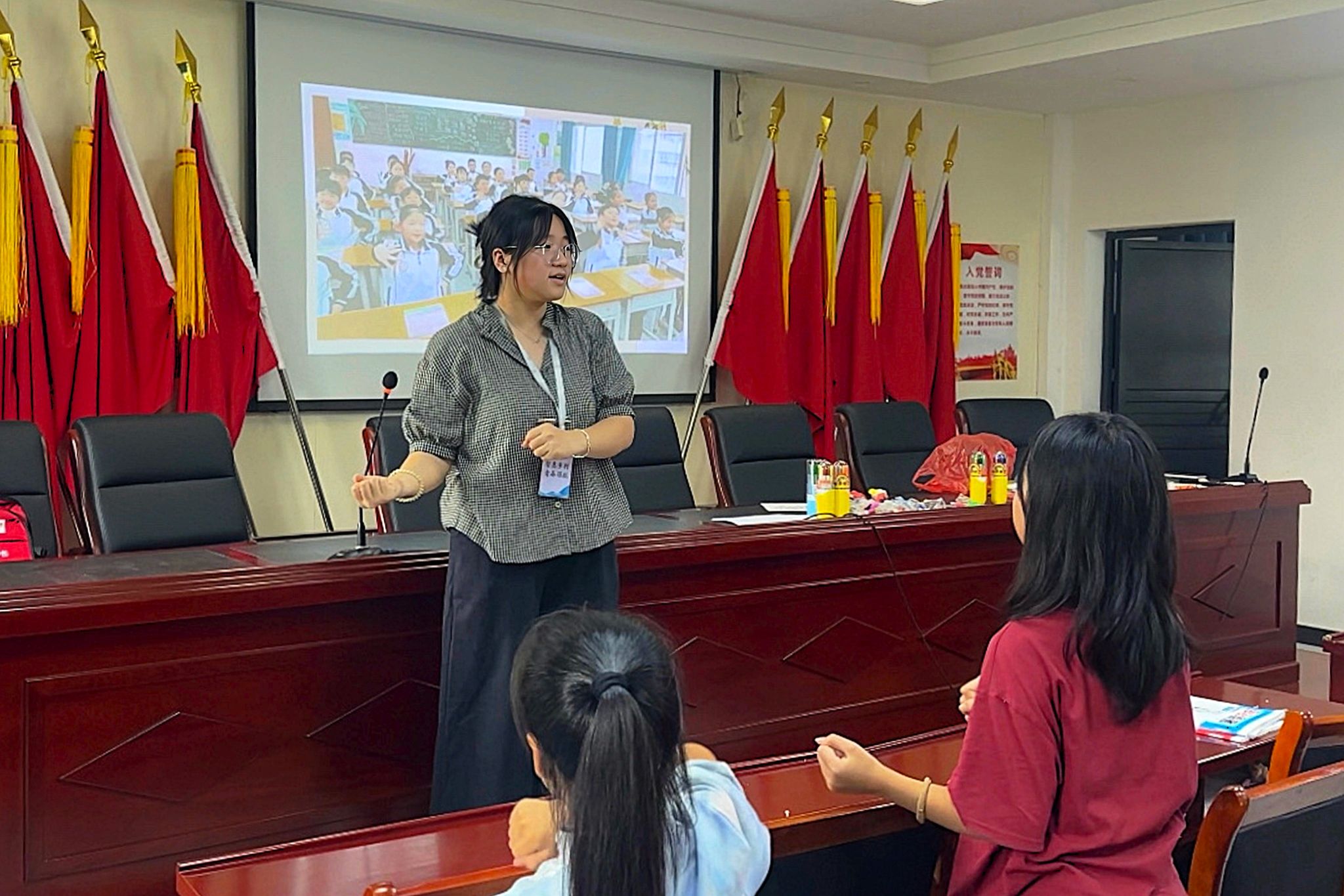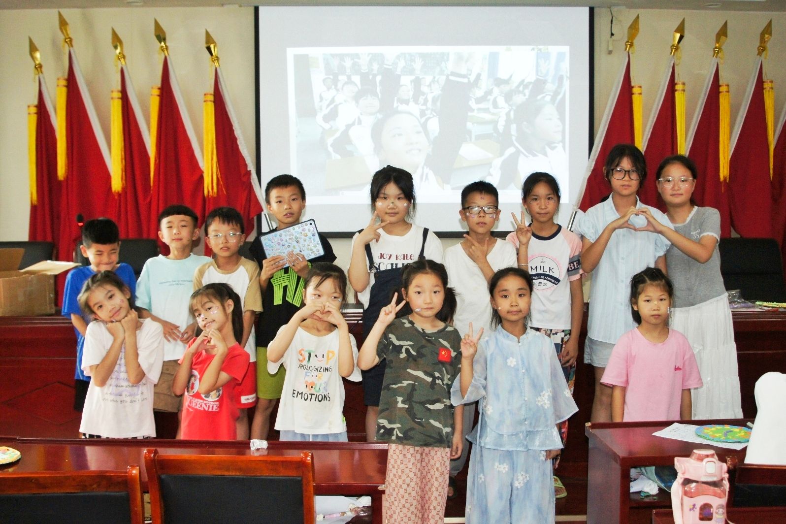 实践团成员通过“go and stop”小游戏带领孩子们舒展身体、活动筋骨,为正式的手势舞学习作准备。在手势舞教学过程中,实践团成员利用教学视频,依据音乐节拍,逐一分解并示范手势舞的基本动作,孩子们聆听音乐、感受节拍,按照指令进行动作模仿。在练习环节,实践团成员带领孩子们跟随音乐逐个动作反复练习,并将孩子们分成小组,每组进行合作练习,孩子们互相帮助,逐渐掌握了舞蹈的节奏和动作要领。实践团成员逐一点评孩子们的手势舞学习成果,表扬孩子们的努力与进步,并分发奖品,鼓励孩子们继续努力。课程最后,孩子们集体展示手势舞并合影。