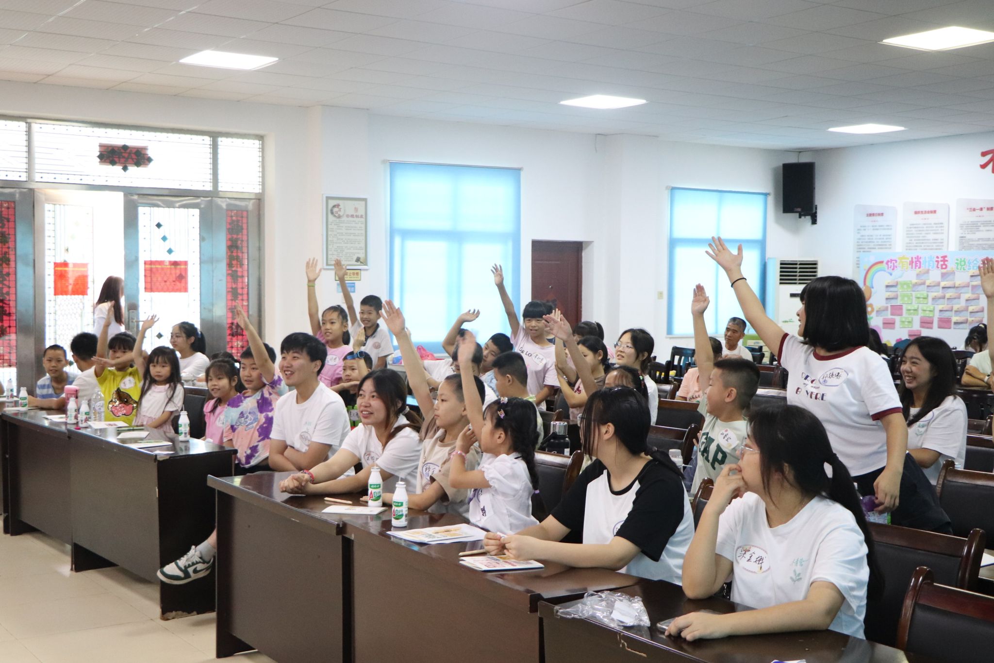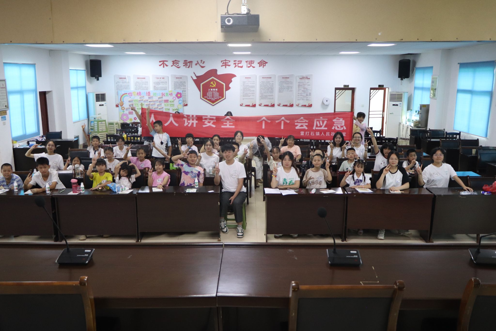 开营仪式上,实践团成员们与小朋友们共同完成“萝卜蹲”、“击鼓传花”、“数字抱团”、“制作悄悄话墙”四款破冰游戏,现场气氛迅速升温。此后,镇政府工作人员趁热打铁,用知识串讲+互动问答的方式送上“安全第一课”。防溺水、交通安全、消防安全、防性侵四大主题轮番登场,孩子们举手抢答,答对了还能收获小奖品,课堂秒变“知识乐园”。