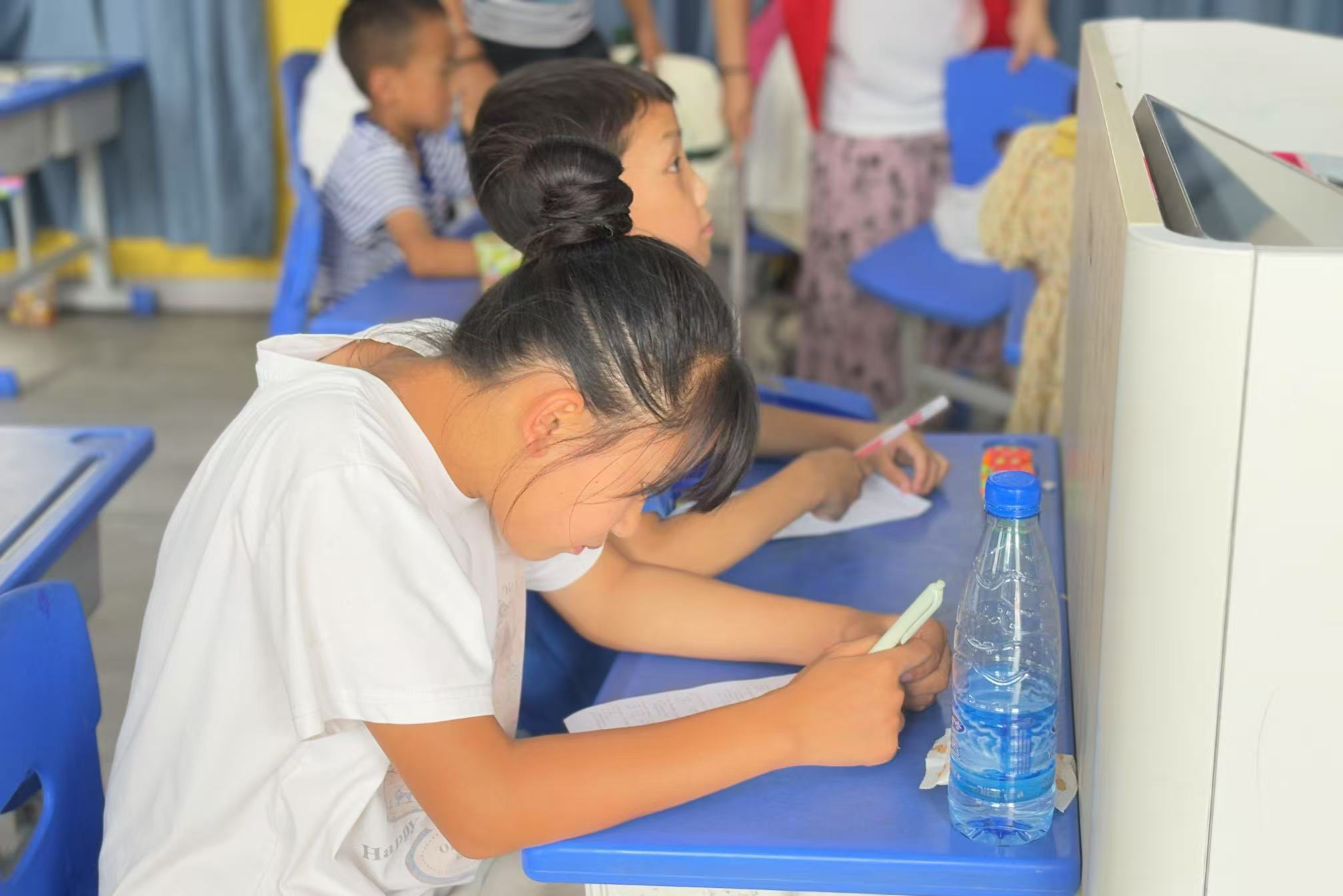 队长曹泽雨开场发言。他代表实践团向排碧公司、当地教师以及参与活动的员工表达了谢意,并对过去一段时间的支教调研工作进行了简要回顾。随后,活动进入员工心声表达环节。孩子们在信纸上写下这段学习生活的感悟,在黑板上留下对教学组成员的祝福。