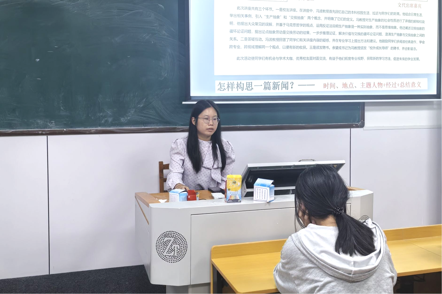 周涵韵从新闻写作与照片拍摄两方面展开分享。新闻写作方面,周涵韵结合“新生合唱比赛”等校园案例解析标题拟定、正文结构规范,强调“时间、地点、人物+经过+意义”的创作逻辑;照片拍摄方面,她围绕设备操作、构图法则、结合活动、会议场景适配讲解,指导员工如何用镜头定格新闻瞬间。讲堂进入尾声时,周涵韵鼓励同学们多去尝试,通过在实践中践行理论来不断提升新闻写作能力。