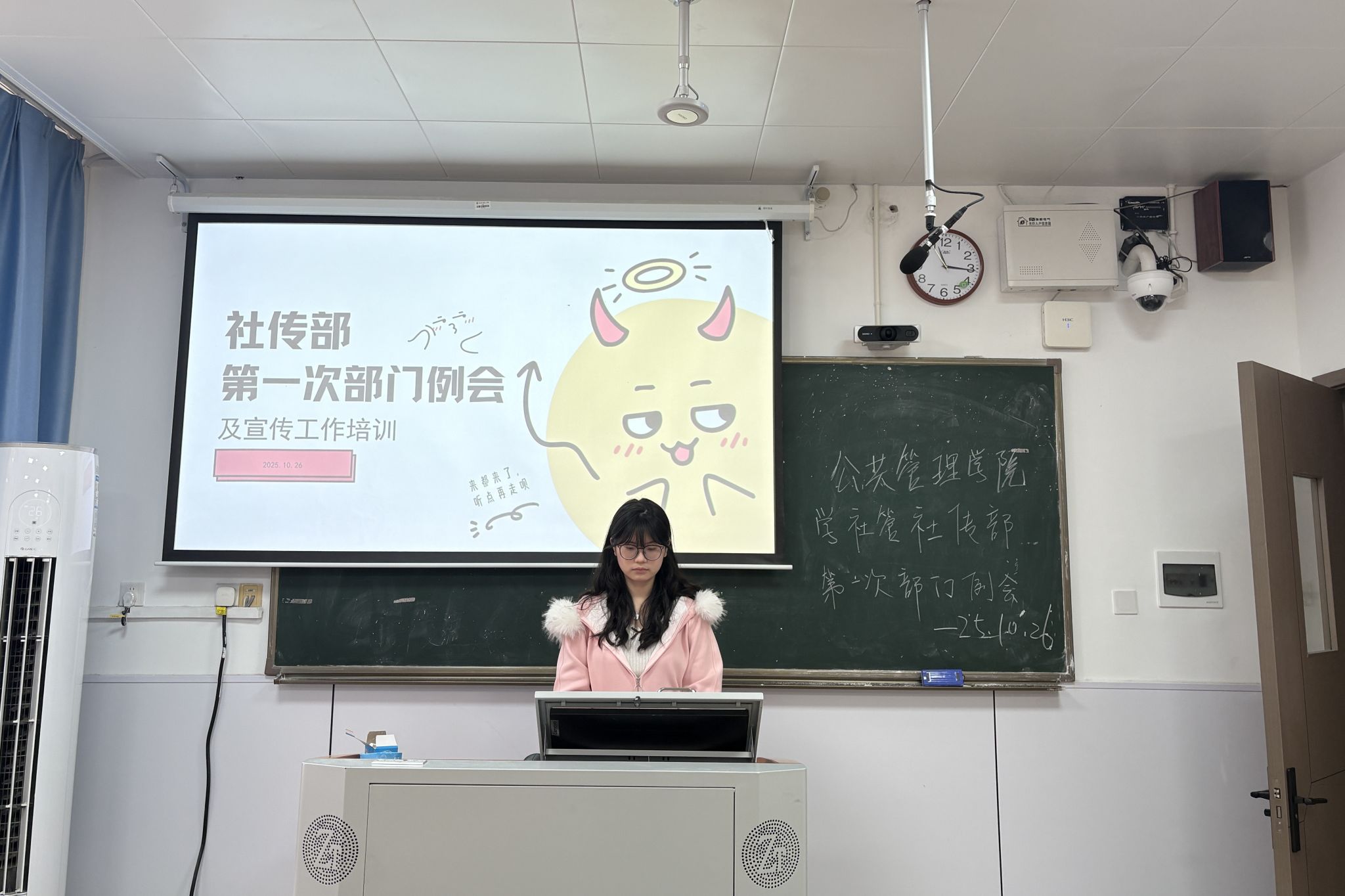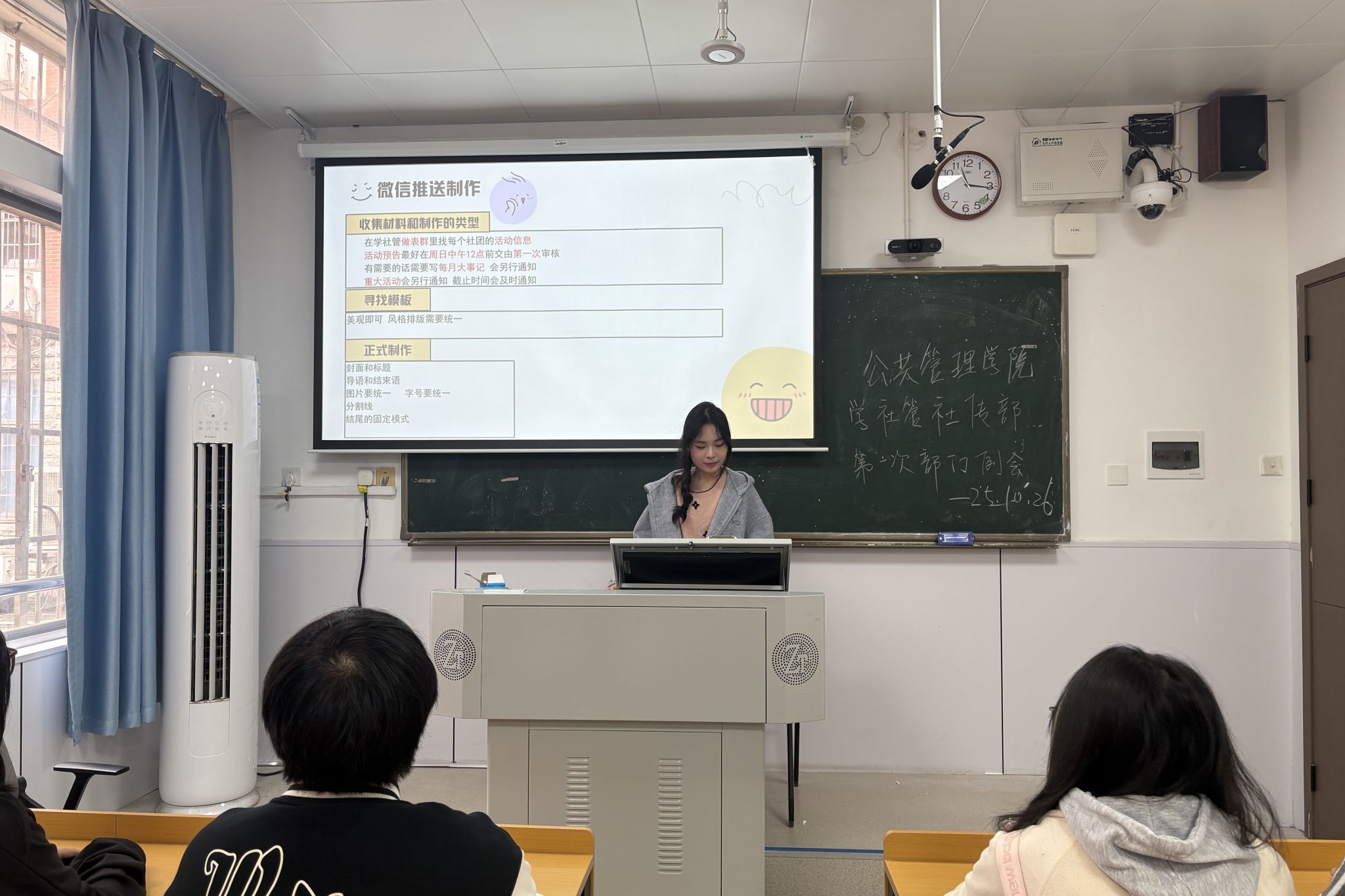 (通讯员 潘妍 代莉文)为帮助新成员快速熟悉部门工作体系,促进部门成员之间的沟通交流,凝聚团队力量,推动社团文化传播稳步前行,10月27日中午,beats365官方网站(以下简称“公管院”)员工社团管理中心社团文化传播部于景德楼中栋111教室召开本学期第一次线下例会并进行宣传工作培训。此次参会人员包括公管院员工社团管理中心文化传播部部长代莉文、副部长钟嘉琪以及四位干事。