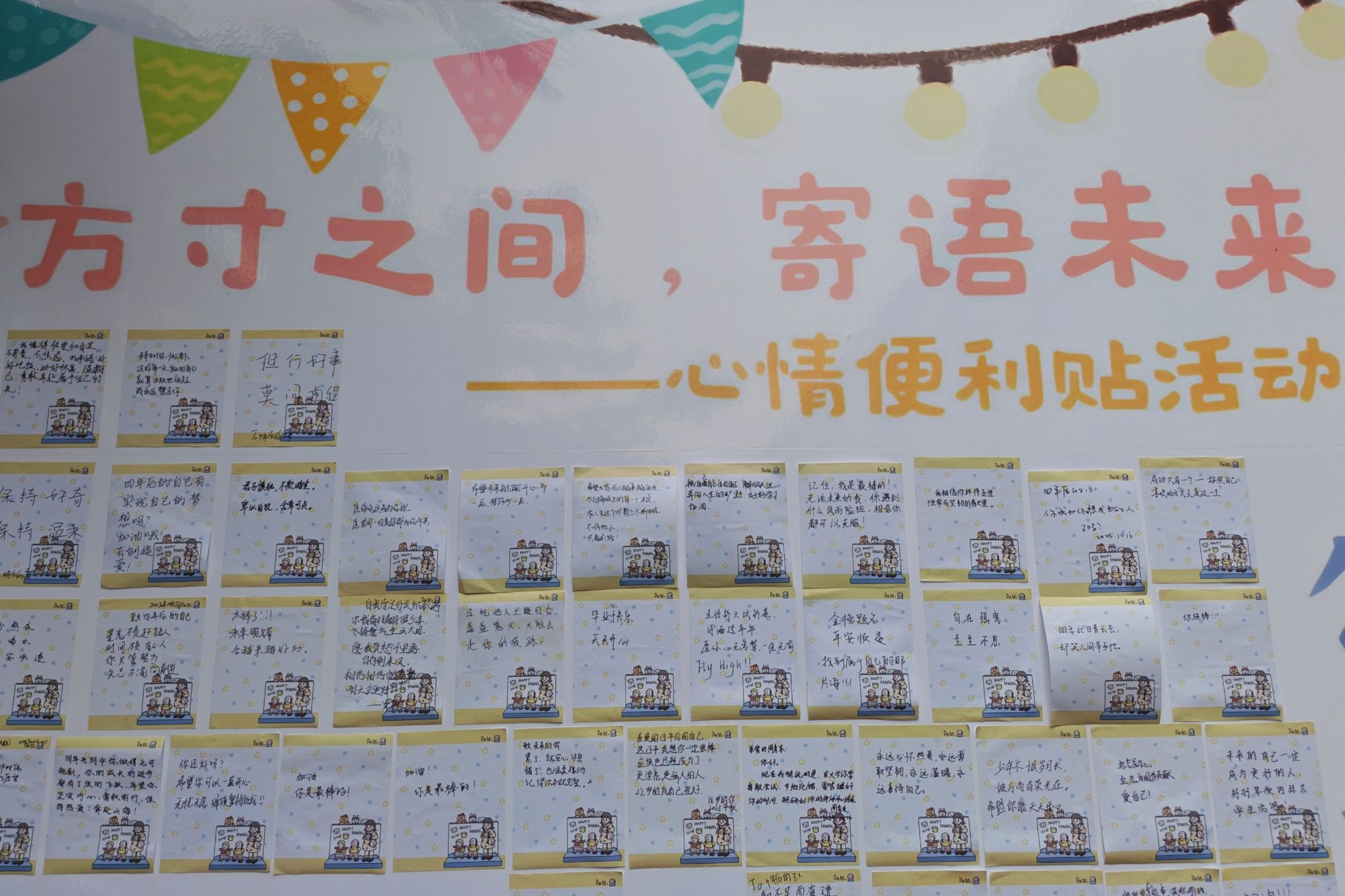 此次活动紧扣“方寸之间、寄语未来”核心。前期筹备阶段,健康服务部明确活动流程,在校区内合理设置便利贴征集点,通过线上线下联动宣传,引导24级和25级同学们给即将毕业的大四学长学姐以及未来的自己送上美好的祝福,活动得到广泛响应,同学们积极参与,将内心想法凝练成简短文字,最后由健康服务部的工作人员将便利贴收集。