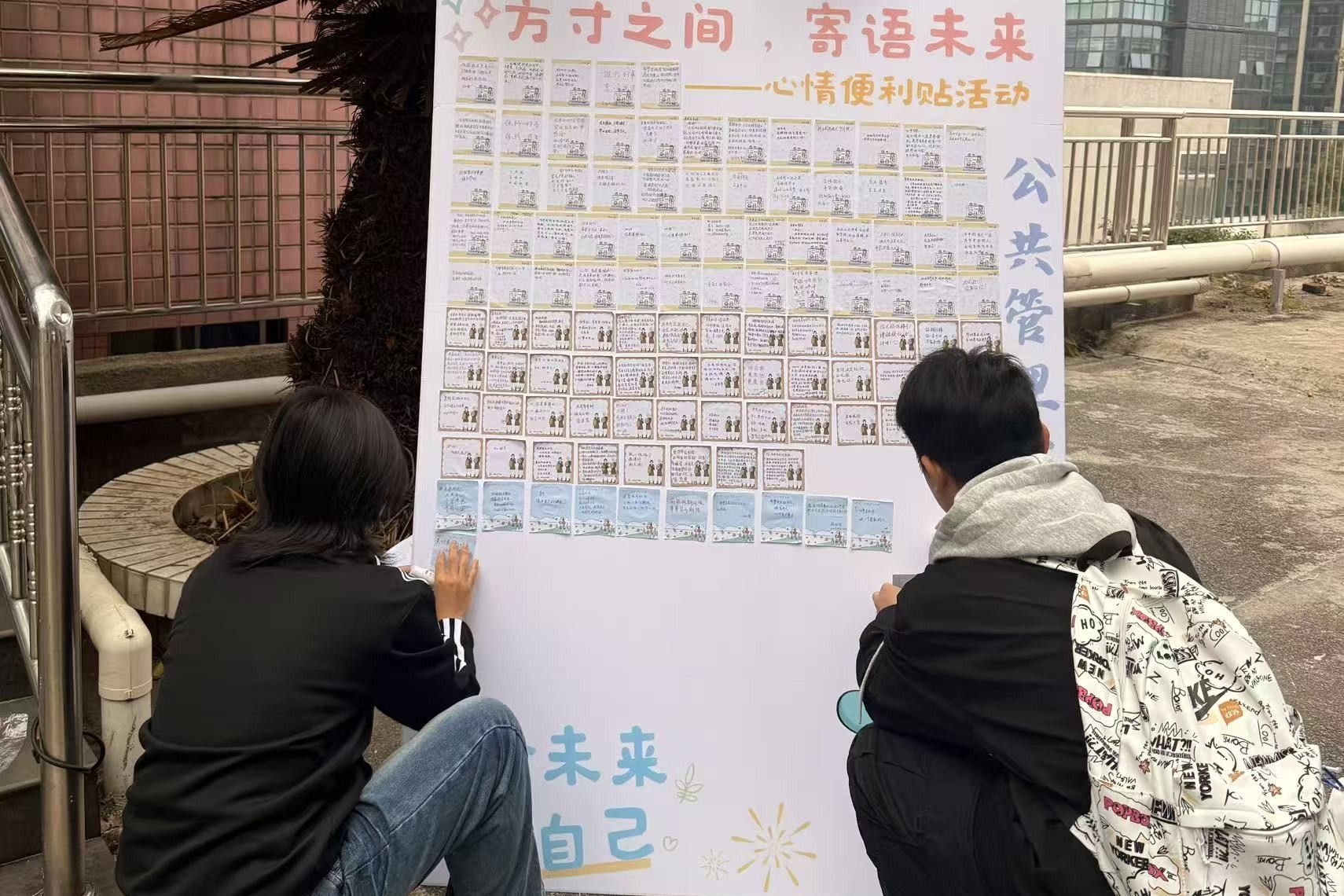 展出当天,健康服务部的工作人员对收集到的便利贴进行分类整理,在二里半校区景德楼和张公岭校区综合楼前有序陈列。一张张色彩各异的便利贴,内容简洁真挚,既有直面挑战的励志感悟,也有温暖治愈的彼此鼓励,直观展现了当代老员工的积极心态。过往同学纷纷驻足浏览,在便利贴留言中寻找共鸣、汲取力量,形成良好互动氛围。