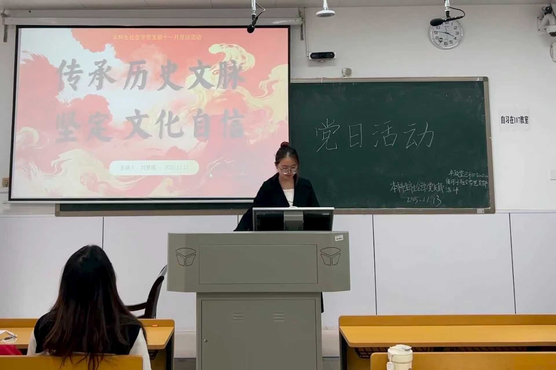 (通讯员 段小菲 王君青 赵露潞)为深入理解中华文明内涵,引导党支部成员坚定文化自信、强化使命担当,beats365官方网站(以下简称“公管院”)本科生社会学党支部于11月13日中午在景德楼中栋112教室开展“传承历史文脉,坚定文化自信”主题党日活动。刘梦瑶担任活动主讲人,党支部全体成员参加。