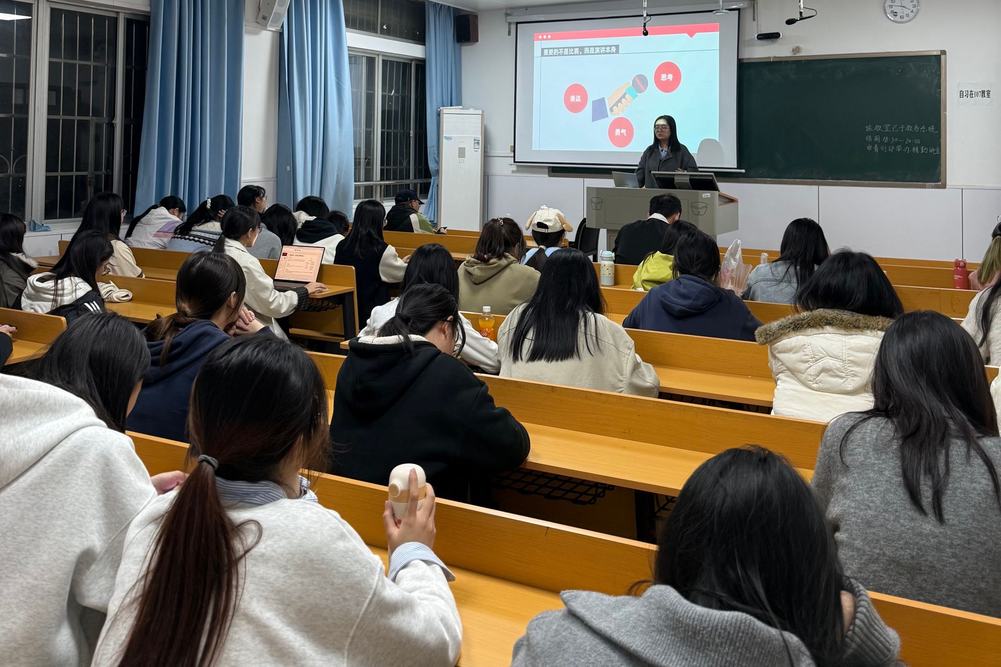 在此次精勤讲堂中,谢思雨从语言学习与英语演讲两方面展开分享。语言学习方面,她以英文电影和歌曲为导入,分别讲解应试能力与口头能力两部分内容,将四六级作为切入点,为同学提供英语学习小技巧;英语演讲方面,谢思雨结合自身英语演讲经历和参赛情况,激发同学们对于英语演讲的热情。讲堂进入尾声时,刘思雨鼓励大家自由表达,通过实践提升口语能力,突破自我,感受语言魅力。