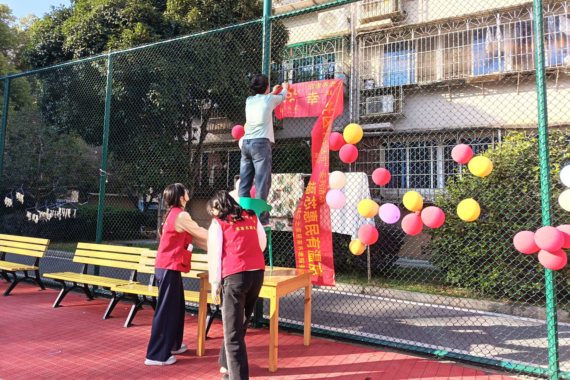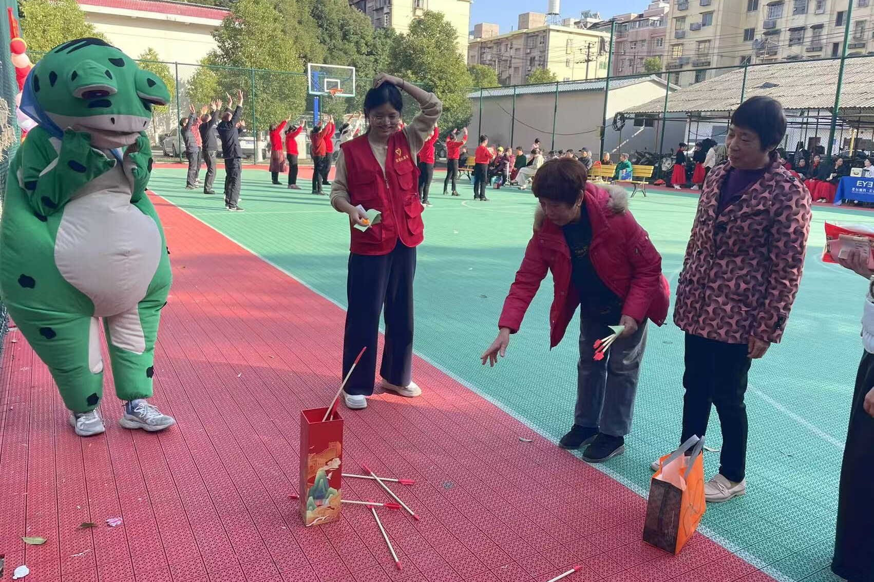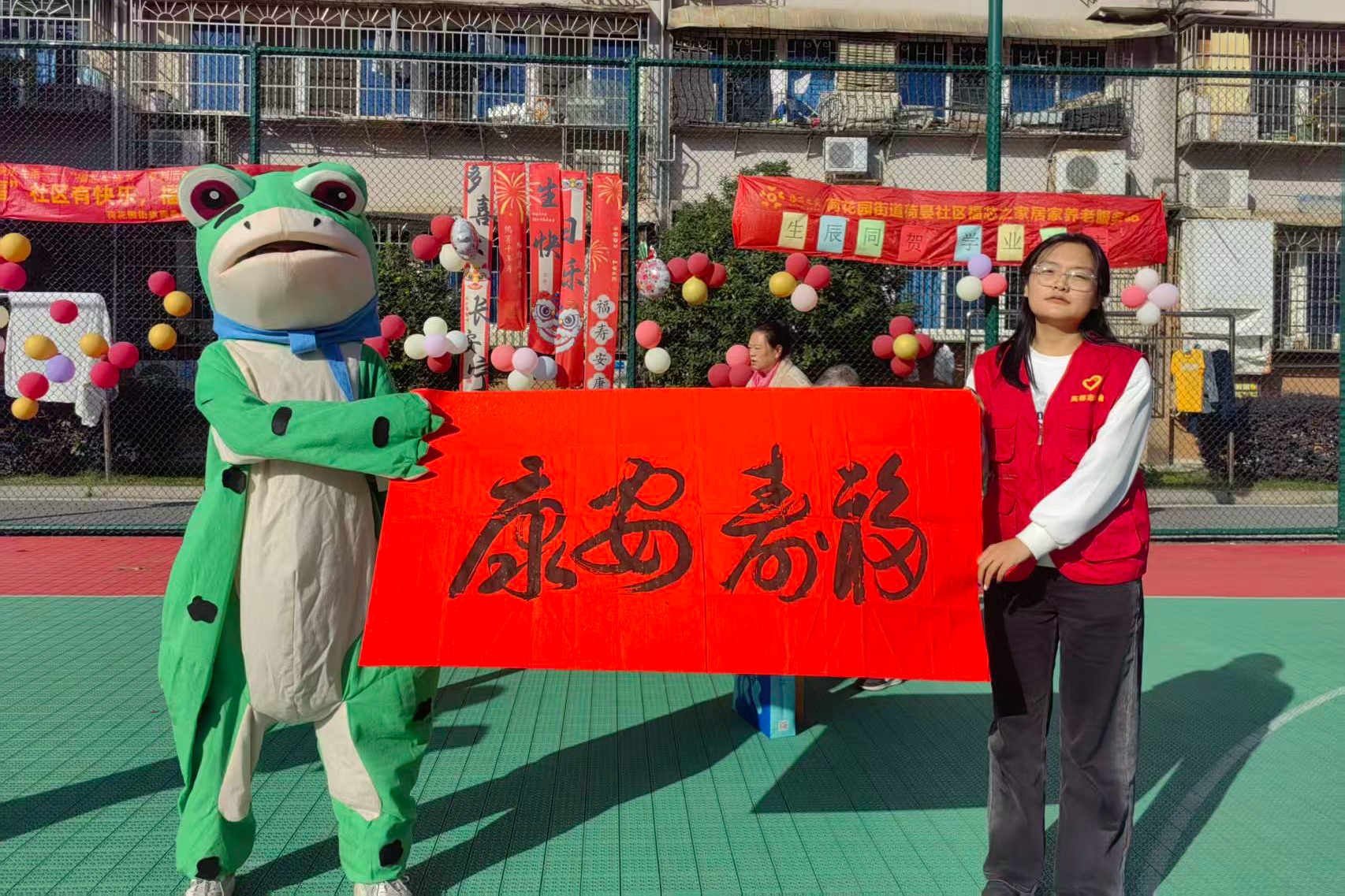 社区篮球场内悬挂着红色横幅与彩色气球,现场温馨氛围浓厚。活动中,身着青蛙造型玩偶服饰的志愿者格外引人注目,他主动与老人打招呼、陪伴老人并亲密互动。身着红马甲的活动志愿者们协助布置了以“生辰同贺”“福寿安康”为主题的相关装饰,并在活动期间陪同老人们参与投壶游戏。现场同步开展健身舞蹈教学,志愿者为参与活动的老人们分发了慰问物资。志愿服务活动的最后,所有参与人员在手写的“福寿安康”红幅前集体合影留念。