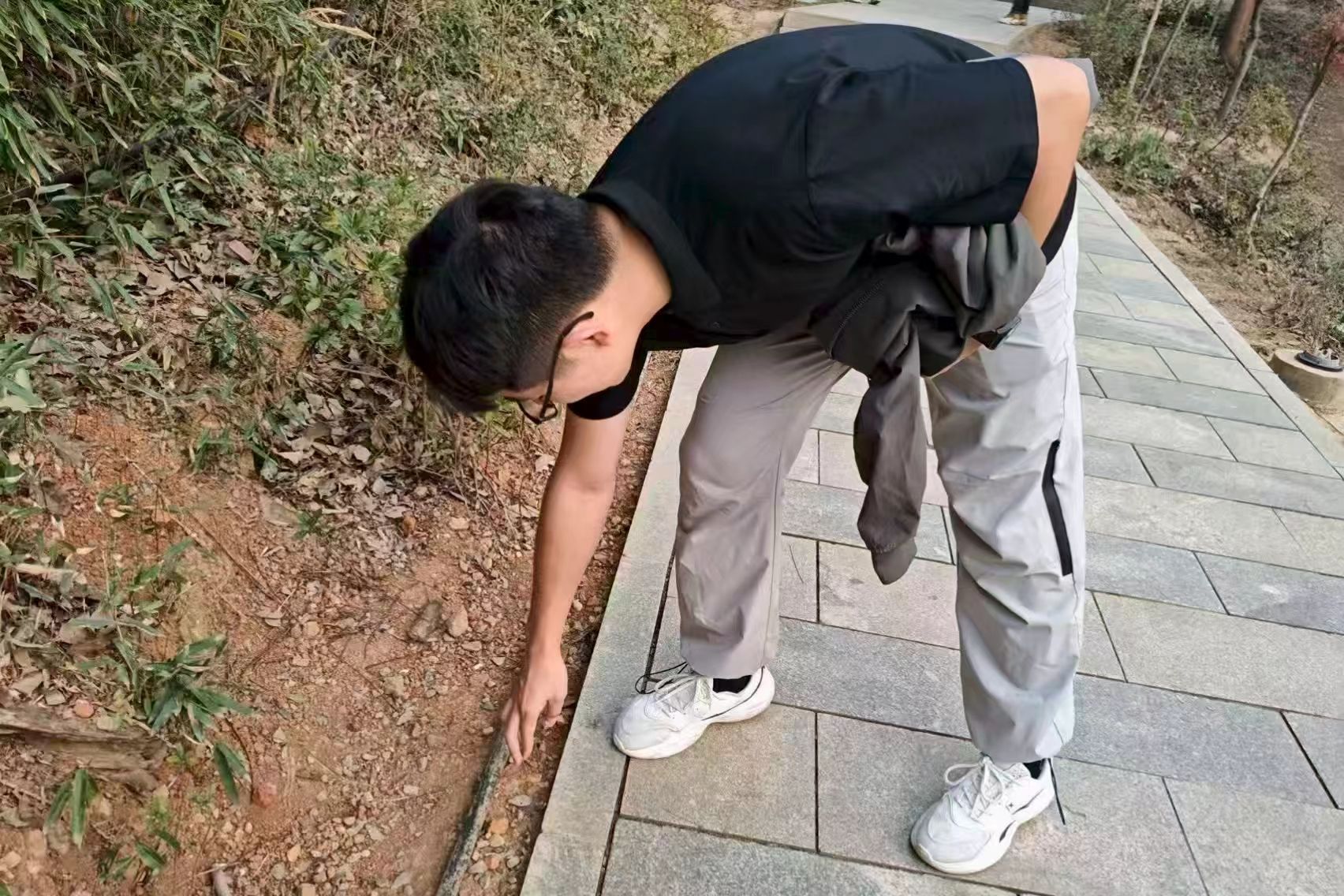 行政管理班50余名员工在岳麓山西门集合。同学们以宿舍为单位列队,手持班旗并展示主题横幅。经过简短动员后,志愿者们佩戴挂牌,开始分组沿景区步道和林间空地清理烟头、食品包装等废弃物,并将垃圾分类投放到指定垃圾桶中。在清理过程中,志愿者们相互配合,团结协作。经过清理,景区步道和林间空地变得更加整洁。