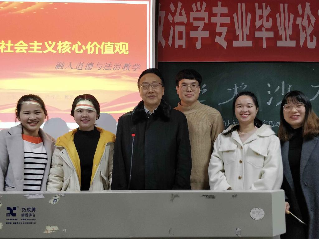 李鑫同学就社会主义核心价值观的基本内涵、重要地位、调查现状和发展历程等方面逐一进行了讲解;陆湘月同学则从社会主义核心价值观融入道德与法治教学的必要性和可行性两个方面进行了说明;王莉同学详细介绍了社会主义核心价值观在初中《道德与法治》教材中具体的融入情况;戴娟同学用一个具体的教学实例分析了如何将社会主义核心价值观融入教学实践。