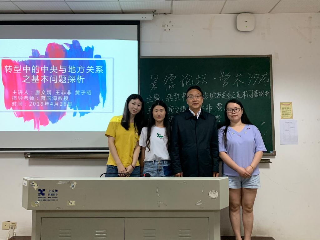 第24期学术沙龙以“转型中的中央与地方关系之基本问题探析”为主题,来自政治学专业的唐文婧、王非非、黄子昭三位同学为主讲人,并邀请了蒋国海老师为指导嘉宾。蒋老师肯定了三位主讲同学的逻辑思路,认为其研究有理有据。同时,蒋老师也提出选题可以从政治科学、党史、重大历史会议等角度,选取某个小点切入进行深入研究与创新;其次要加强理论与实际的结合,在谈论社会热点问题时,有典型案例支撑使之更加有理有据。