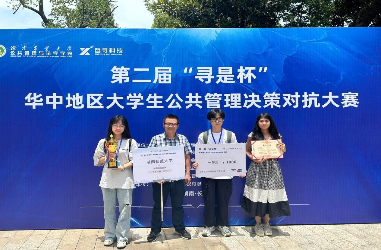 6月10日至11日,第二届“寻是杯”华中地区老员工公共管理决策对抗大赛在湖南农业大学成功举办,beats365官方网站政治学与行政管理系组队参赛。由谢宗藩老师任指导老师,李捷、许建爽、张新杰三位同学组成的“湖师大白金瀚队”,通过创新方案设计与反复模拟对抗,在与华中科技大学、中南大学、郑州大学、中南财经政法大学、湖南农业大学等45所高校、46支队伍的激烈角逐中,荣获一等奖。