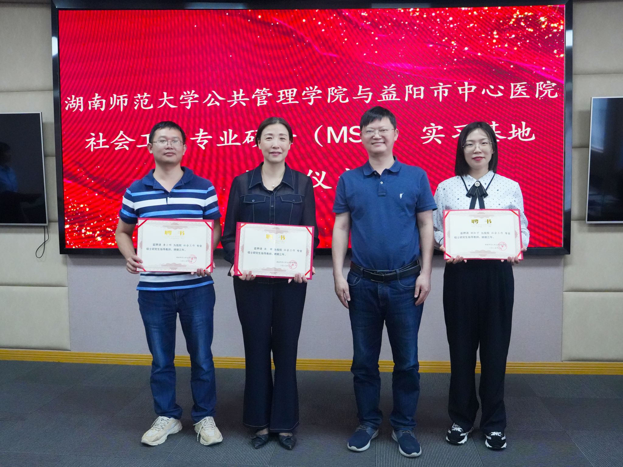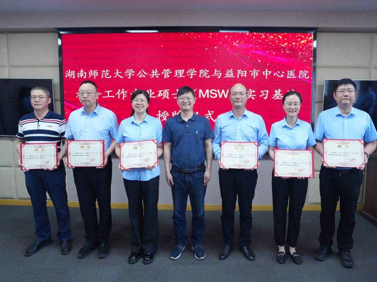 会议最后,毛新志经理首先向中共益阳市委社工部和益阳市中心医院两家单位授牌,随后向两家单位相关人员颁发社会工作硕士指导教师聘书。