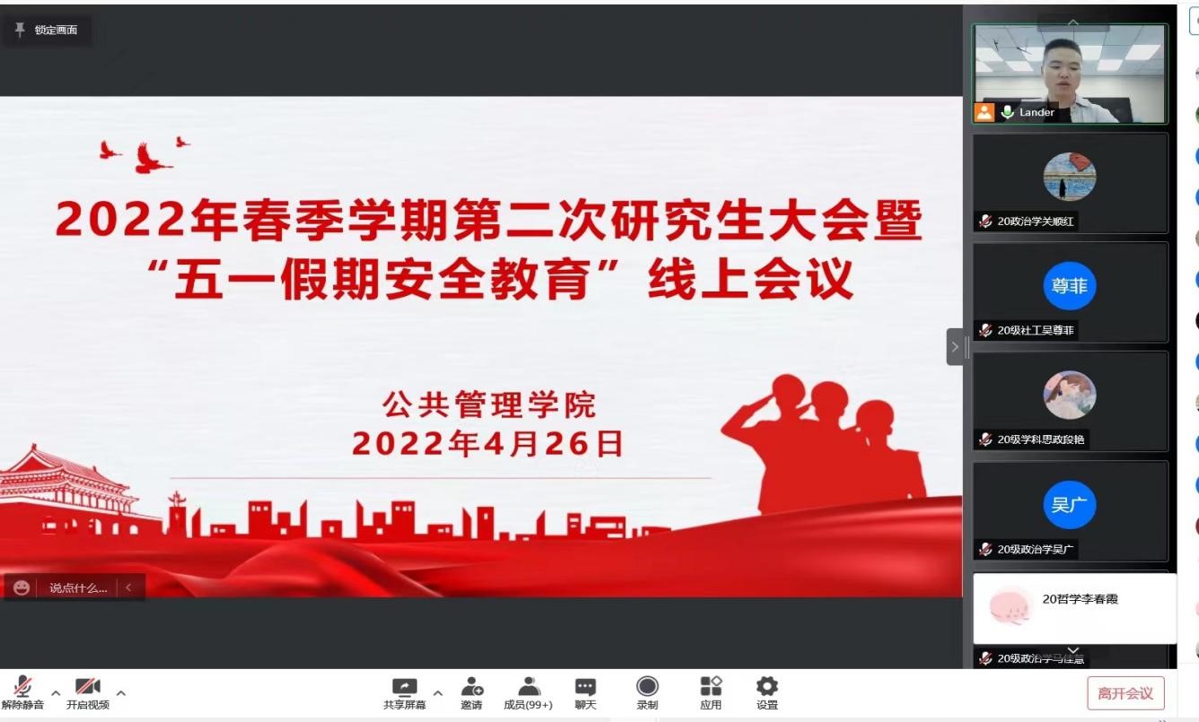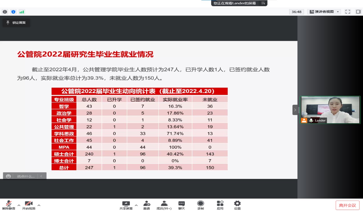 在请假、离长问题上,胡老师提醒同学们放假期间要谨慎出行,非必要不离长,严格配合疫情防控工作,若有特殊情况确需离长须提前报备,填写《离长申请书》,经家长同意—导师知情—研办报备—防控办审批形成完整的请假流程,对擅自离长且不及时请假的员工,依据疫情期间相关条例给予立体化严肃处理。随后,胡老师宣读了五一期间相关注意事项并呼吁各位同学积极参与2020与2021级年级3主席的竞选。最后,陈怡老师就公司19级研究生目前就业情况报告进行解读。她表示,今年毕业人数与往年相比增加了一百六十七万,就业形势非常严峻,要求准毕业生深刻分析当前严峻的就业形势,结合自身实际正确定位就业目标与方向,充分提升就业能力,加强与导师的沟通交流,增强就业信心,把握就业时机,为求职做好充分准备。