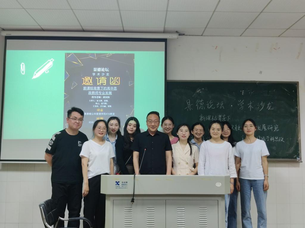 第26期“景德论坛·学术沙龙”活动以“新课标背景下高中政治教师专业发展研究”为主题,来自学科教学(思政)专业的易玉林、赵琏、王光环、甘小丽、赵雪阳、梁艳、杨云七位同学为本次活动的主讲人,并邀请了思想政治教育学系蒋国海老师前来指导。七位主讲人阐述了教师专业发展的内涵并分析了新课标对高中政治教师专业发展的新要求,进一步提出了政治教师专业发展存在的问题和发展的对策。蒋国海老师认为此次学术沙龙的选题很好,十分贴切学科教学(思政)专业,此次活动从背景、内涵、问题、原因、对策的思路展开,体现了逻辑清晰完善的特点,是一次非常成功的学术活动。