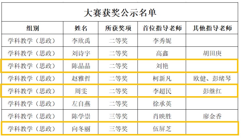 从预选、初赛到决赛,公司学科教学(思政)硕士点负责人彭继红教授认真组织赛前训练,并全程悉心指导。李超民教授、刘艳副教授、伍屏芝老师、黄治清老师也给予了专业、耐心的指导。比赛全程,各位参赛选手皆认真准备、积极备赛,指导老师们在学科知识、视频录制、教学技能等方面对三位参赛选手都进行了全面指导,最终共同获得了优异成绩。