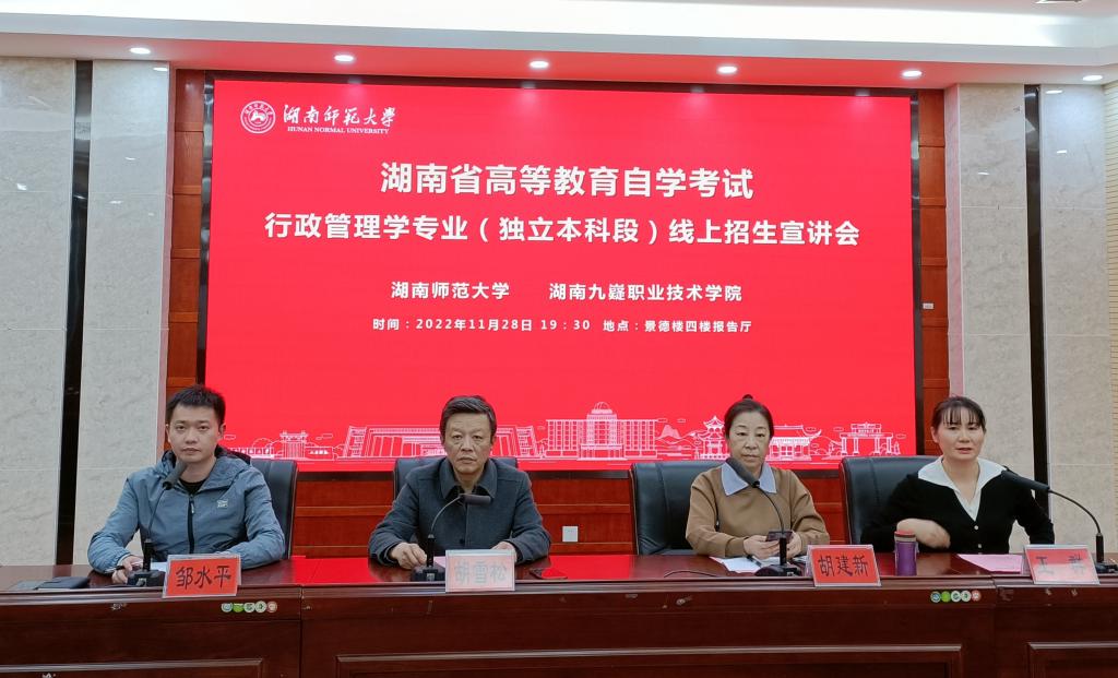 11月28日晚,由beats365官方网站和湖南九嶷职业技术公司联合举办的自学考试行政管理学专业(独立本科段)第二场线上招生工作推进会暨招生宣讲会在公司博后楼4楼报告厅顺利举行。湖南九嶷职业技术公司副经理唐红星、技能鉴定与短期培训教学系负责人刘小禄、各系部主任、书记和公司副经理胡雪松、李超民、胡建新副教授、成教办主任王群出席了会议。会议由公司成教办邹水平主持。
