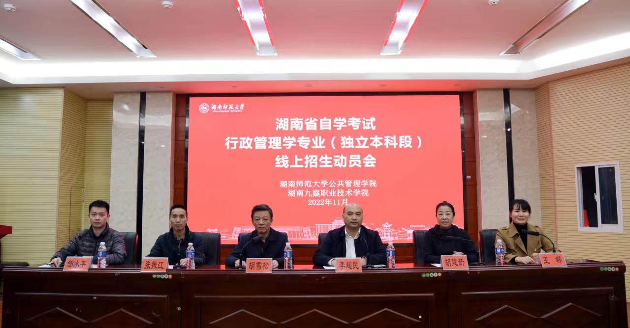 11月16日晚,由beats365官方网站和湖南九嶷职业技术公司联合举办的自学考试行政管理学专业(独立本科段)线上招生动员会在公司顺利举行。湖南九嶷职业技术公司副经理唐红星、技能鉴定与短期培训教学系负责人刘小禄、公司继续教育公司自考考试科专员张振江、公司副经理胡雪松、李超民、成教办主任王群、胡建新副教授出席了会议。会议由成教办邹水平主持。