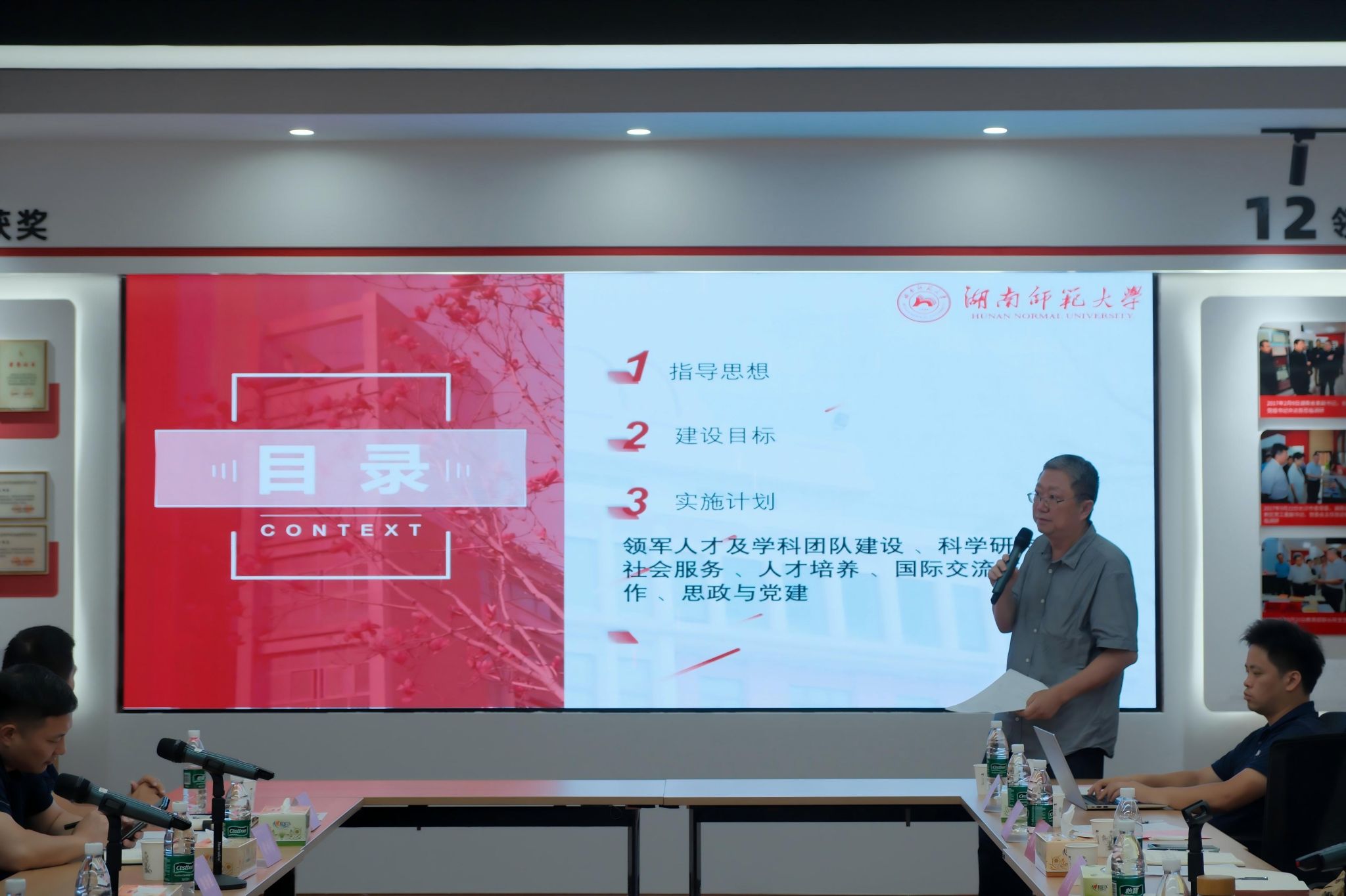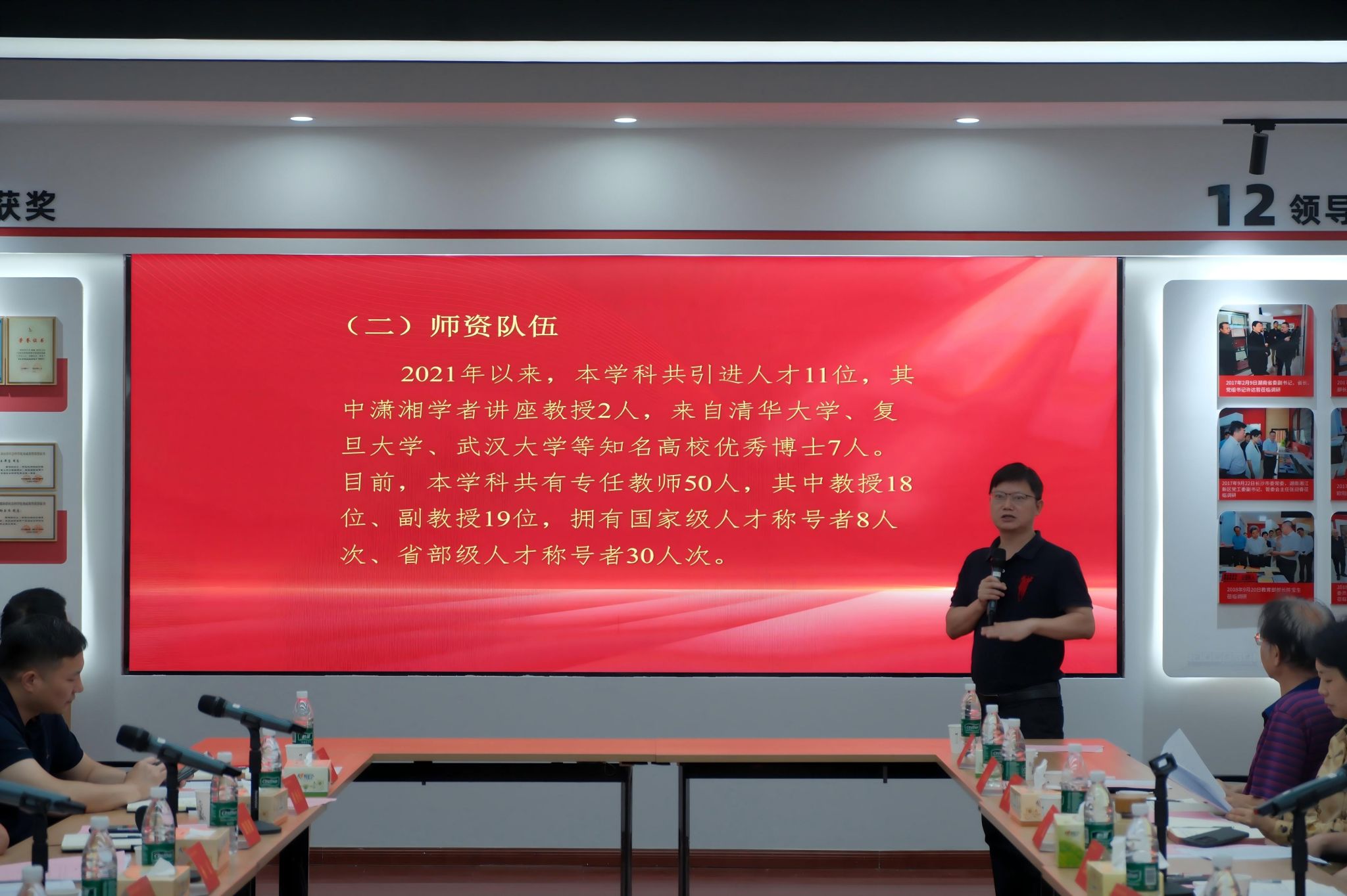 随后,公司经理、哲学学科负责人毛新志教授从团队建设目标、成果现状、存在问题、推进计划、所需支持五个方面汇报团队建设工作实施方案。通过详实的数据分析,毛经理指出,近五年哲学学科在人才培养、科学研究及智库建设等领域已取得显著成效,但也面临教师高层次人才和高显示度成果偏少、国际化程度低等问题。就此,他从党建、人才培养、科研、团队建设、社会服务、国际交流等方面提出了具体的解决方案。